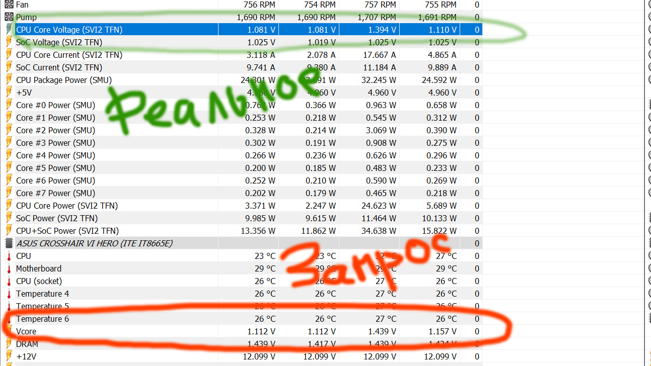 Помогите определиться с предельной напругой на проц раз и навсегда. Что имеем: - в BIOS настройка VDDCR - то, что я задаю ручками (плюс LLC но не об этом ща) - в HWiNFO две напруги, а именно VDDCR CPU, CPU Core Voltage - мультиметр висящий минусом в молексе а плюсом на дросселе VRM.