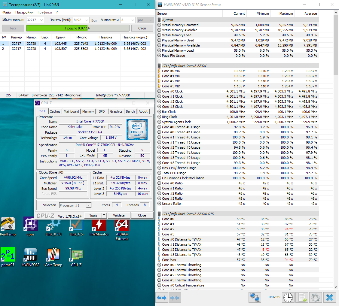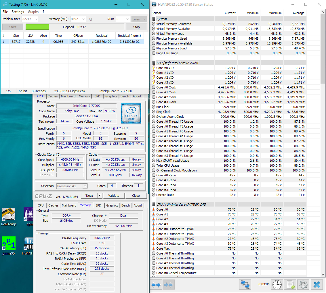 Доброго, добрался ко мне 7700k (без скальпа) + мать Asus Z270F, кулер Noctua NH-D14, решил немного разогнать. Результаты огорчили, 4500 (1.18V!) на мануалке (llc 6), память 3200 и LinX 0.6.5 получаю 92 градуса! (вложение 2), память 2133 - уже лучше, но не фонтан (вложение 1) Два месяца назад у меня был 6700k (без скальпа) + Asus Z170 Pro Gaming, бегал на 4500 при 1.32V, память такая же, кулер тоже, настройки биос идентичные, температуры в LinX 0.6.5 не привышали 80 градусов, в 0.7.0 были 89-92. С таким напряжением такие конские температуры, погуглил, такого не нашел, соплей и тех пожалаели(( 13 градусов , в таком же раскладе, при разгоне КП на скае 3-5 градусов разница была.