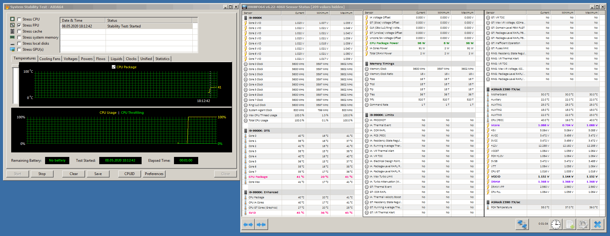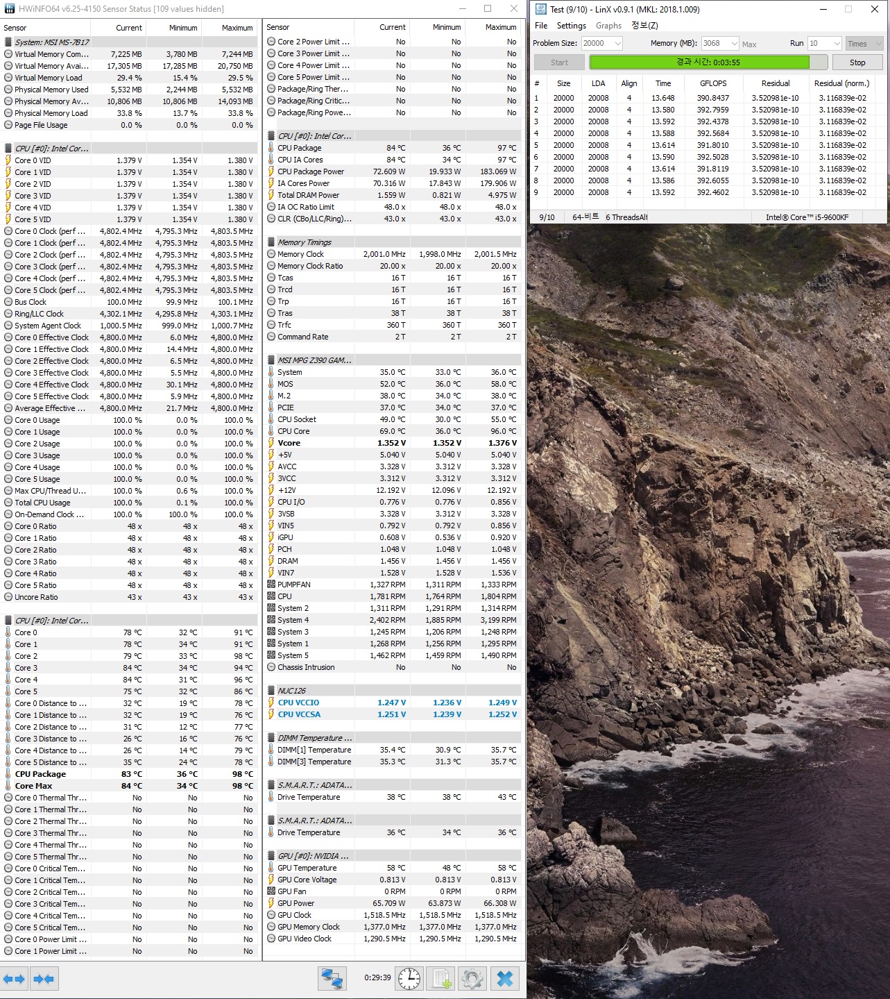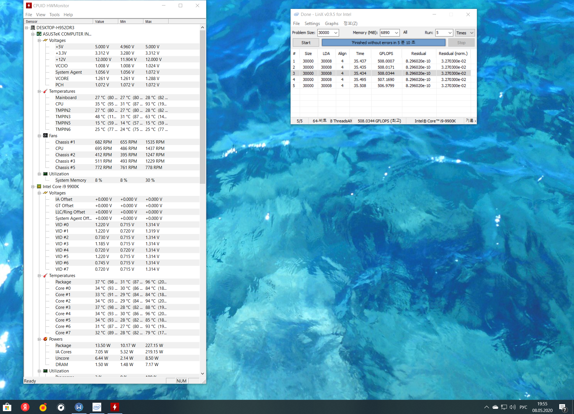 Полученный результат должен иметь следующий вид: Скриншот рабочего стола после прохождения >9 циклов (т.е. между 9 и 10 проходами). Вместе с LinX на рабочем столе должны быть развернуты CPU-Z (первая вкладка) и Core Temp, это обязательный минимум. Такой набор программ даст информацию о напряжении и температурах под нагрузкой-простоем. По желанию можете добавить другие программы, показывающие дополнительную информацию о вашей системе, например третью вкладку CPU-Z, которая покажет модель материнской платы и версию BIOS. Пример результата разгона: Mad Max, 5100 МГц (AVX 0), i7-8086K, HT-ON, Cache 4700, Vcore=1.36V, Batch L805E123, Gigabyte Z370 Aorus Gaming 7 (bios F6), Be Quiet! Dark Rock Pro 4, ЖМ под HS, Windows 10 Pro 64-bit 1809, LinX 0.9.3 64bit.