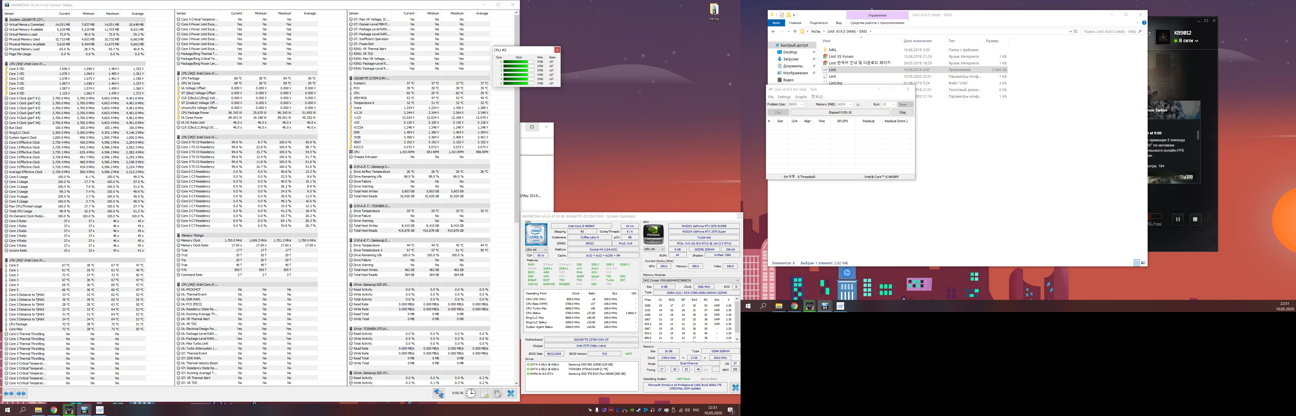 Полученный результат должен иметь следующий вид: Скриншот рабочего стола после прохождения >9 циклов (т.е. между 9 и 10 проходами). Вместе с LinX на рабочем столе должны быть развернуты CPU-Z (первая вкладка) и Core Temp, это обязательный минимум. Такой набор программ даст информацию о напряжении и температурах под нагрузкой-простоем. По желанию можете добавить другие программы, показывающие дополнительную информацию о вашей системе, например третью вкладку CPU-Z, которая покажет модель материнской платы и версию BIOS. Пример результата разгона: Mad Max, 5100 МГц (AVX 0), i7-8086K, HT-ON, Cache 4700, Vcore=1.36V, Batch L805E123, Gigabyte Z370 Aorus Gaming 7 (bios F6), Be Quiet! Dark Rock Pro 4, ЖМ под HS, Windows 10 Pro 64-bit 1809, LinX 0.9.3 64bit.