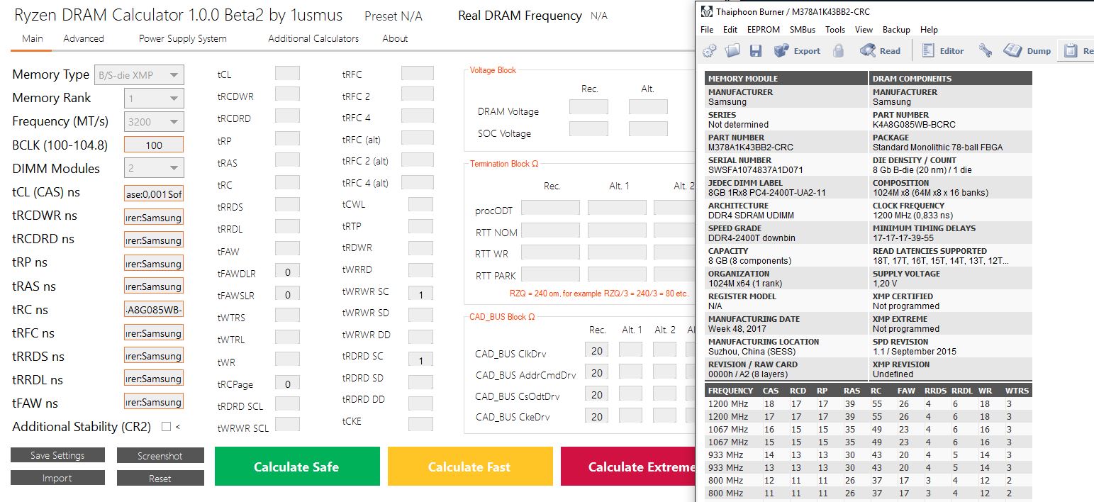 Да, рано радовался. Пришлось слезать на Safe тайминги и поднимать напругу из-за BSOD-ов. Но что-то не так всё-равно: LinX 0.7.0 10 прогонов с 6гб проходит, флопсы вроде более-менее ровные, residual одинаковый. Мемтест на 12 окон с 750мб памяти 100%+ без ошибок. Но не-нет вылетит из игры, либо BSOD при открытии браузера, как такое может быть? Ещё такие вопросы интересуют: терминатор RTT_WR в калькуляторе OFF потому что его рекомендовано отключать или потому, что значение нужно подбирать экспериментально, т.к. помнится 1usmus говорил, что не стоит оставлять данные показатели "без присмотра"? CAD_BUS тайминги (которых 3) оставлять авто, есть смысл подбирать значения и есть ли алгоритм? CLDO_VDDP на платах MSI то же самое, что на ASUS или то же, что на ASUS просто VDDP? Заметил, что рестарты происходят чаще из-за нехватки напряжения на проц, т.к. в авто с разогнанной памятью всё заводится с первого раза, а вместе с разогнанным процессором колдбуты. При старте на проц в авто подаётся, судя по показателям, 1.4+ volt, в работе показатель падает до 1.2625-1.3, как в момент старта компенсировать это? Перебор разных режимов LLC не помогает, напругу проца и SoC тоже не хотелось бы задирать.