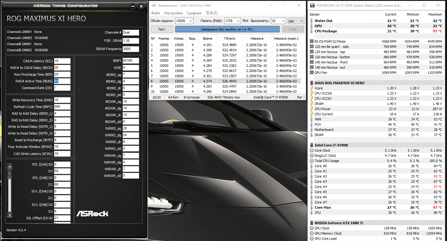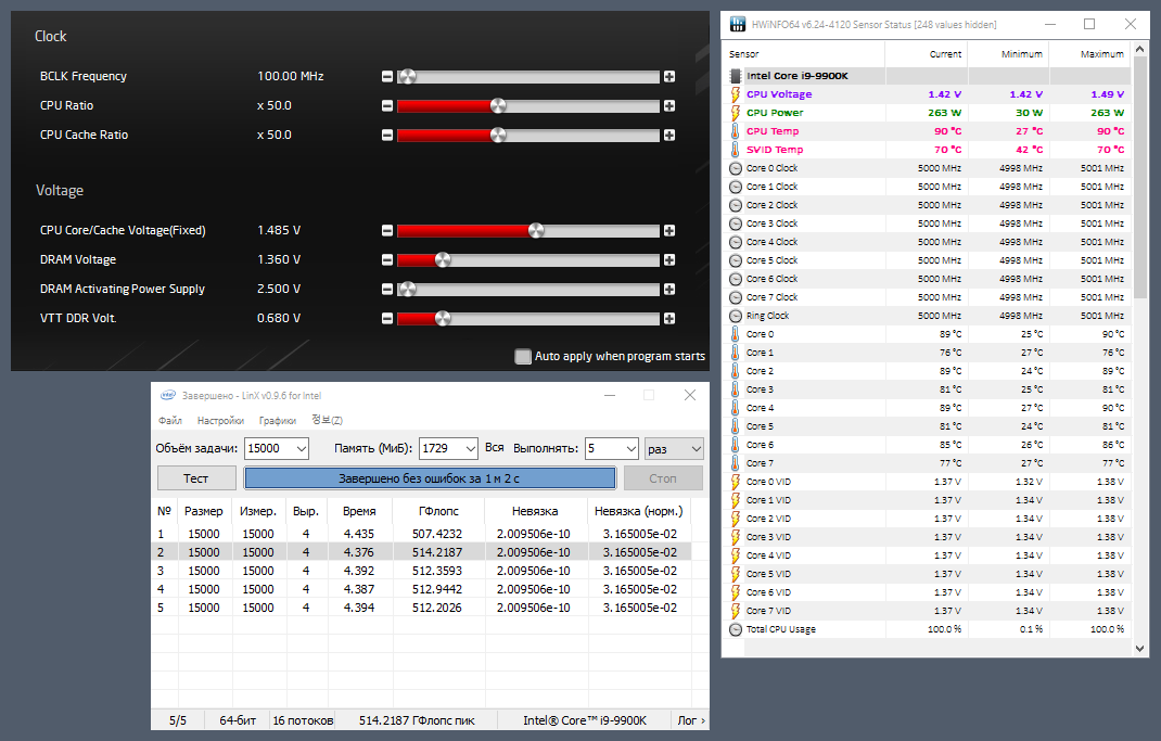Полученный результат должен иметь следующий вид: Скриншот рабочего стола после прохождения >9 циклов (т.е. между 9 и 10 проходами). Вместе с LinX на рабочем столе должны быть развернуты CPU-Z (первая вкладка) и Core Temp, это обязательный минимум. Такой набор программ даст информацию о напряжении и температурах под нагрузкой-простоем. По желанию можете добавить другие программы, показывающие дополнительную информацию о вашей системе, например третью вкладку CPU-Z, которая покажет модель материнской платы и версию BIOS. Пример результата разгона: Mad Max, 5100 МГц (AVX 0), i7-8086K, HT-ON, Cache 4700, Vcore=1.36V, Batch L805E123, Gigabyte Z370 Aorus Gaming 7 (bios F6), Be Quiet! Dark Rock Pro 4, ЖМ под HS, Windows 10 Pro 64-bit 1809, LinX 0.9.3 64bit.