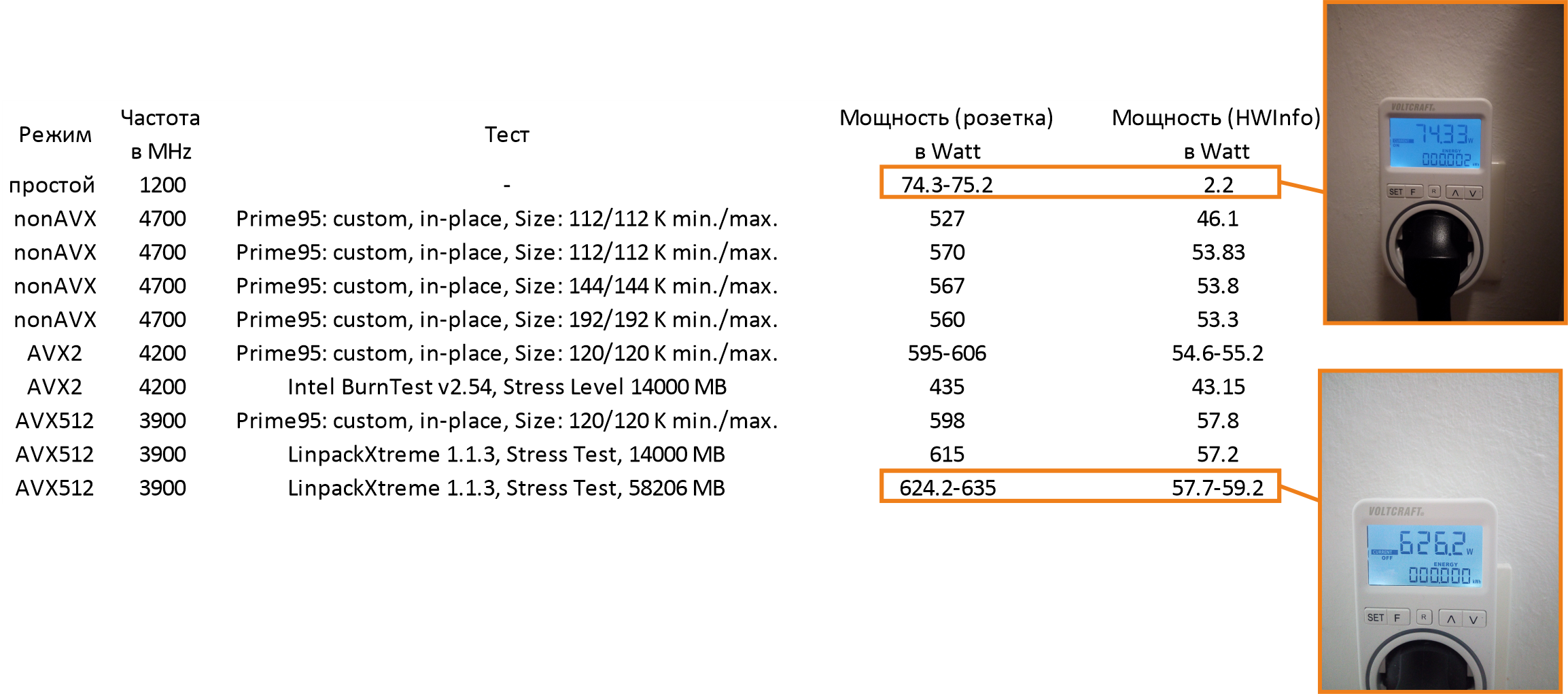 Ниже небольшая таблица потребности энергии в Watt, как сравнение между мощностями из розетки и HWInfo при разных тестах. Из этих даных я примерно вывел формулу для расчёта потребности процессора при разных тестах. Например, HWInfo показывает 53, отнимаете 2.5, умножаете на 10 и получаете примерную потребность процессора (53-2.5)x10=505 W (плюс/минус 20-30 W)