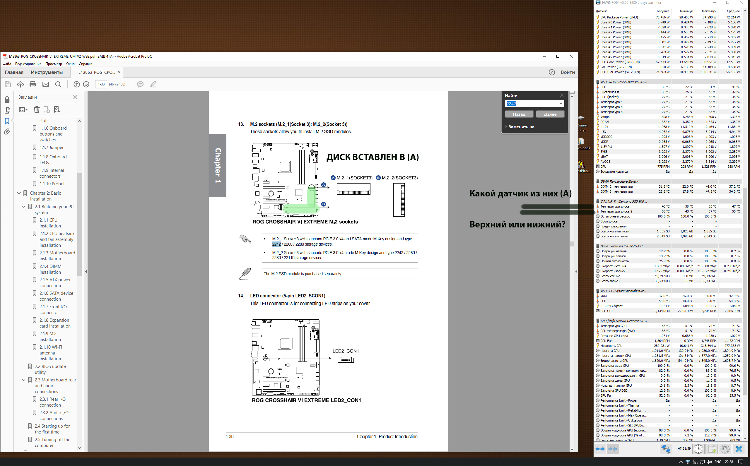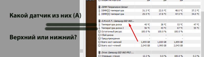 Здравствуйте , не подскажите . Вопрос есть материнская плата Материнка Rog Crosshair Extreme. в ней M2 - 2шт . M.2_1 и М.2_2 размещение слот (А) и слот (В) . ССД вставлен в слот (А) M.2_1 - на какой датчик температуры ориентироваться в HWiNFO64? на верхний или нижний? Температура диска Температура диска 2