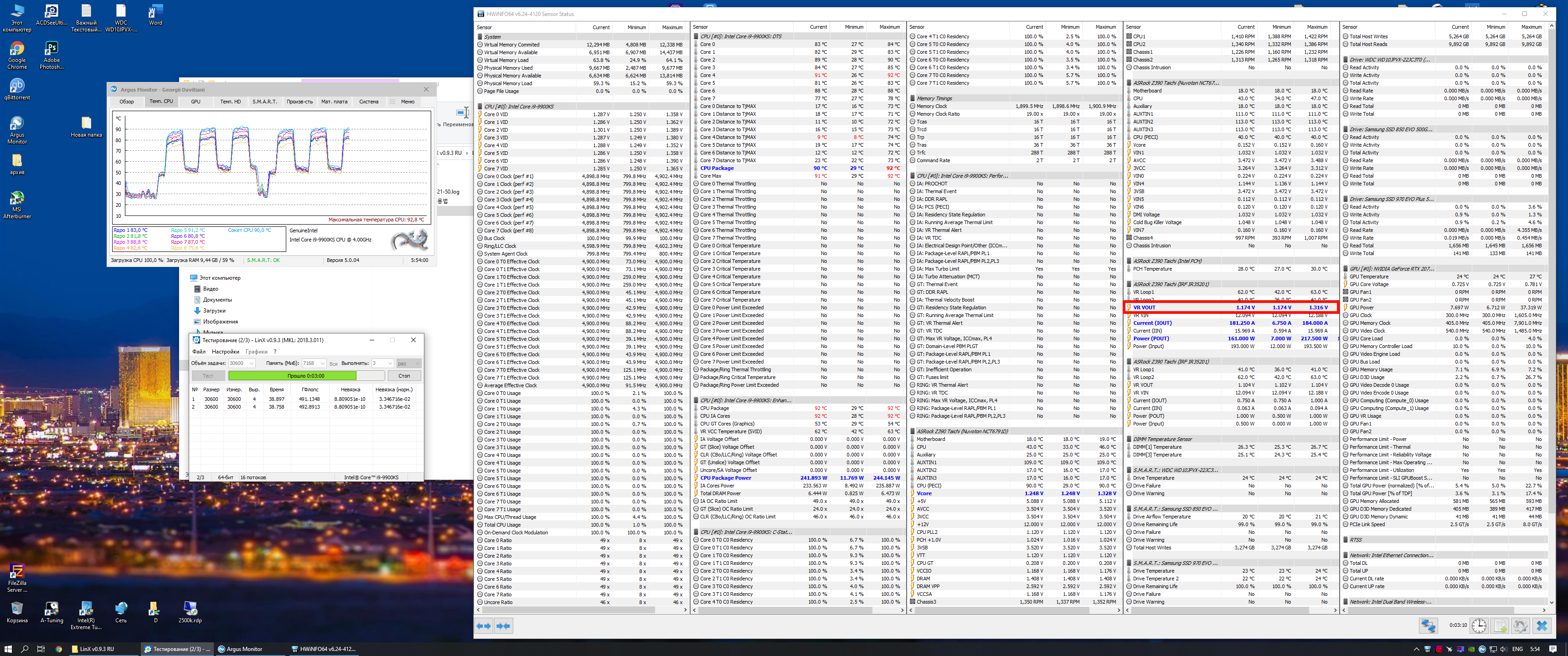 Никак не могу понять, у меня экземпляр процессора УГ или нет. В теме материнок Асрок, говорят на Vcore показывает непонятно что и смотреть надо на Vr Vout, что очень логично. Тогда второй вопрос возникает вольтаж какой считать за корректный, тот который под нагрузкой? Вот такие результаты на 4.9 и Ноктуа с 1 вертушкой (500+ гфлопс будет если вырублю всякий левый софт, но кому оно надо)