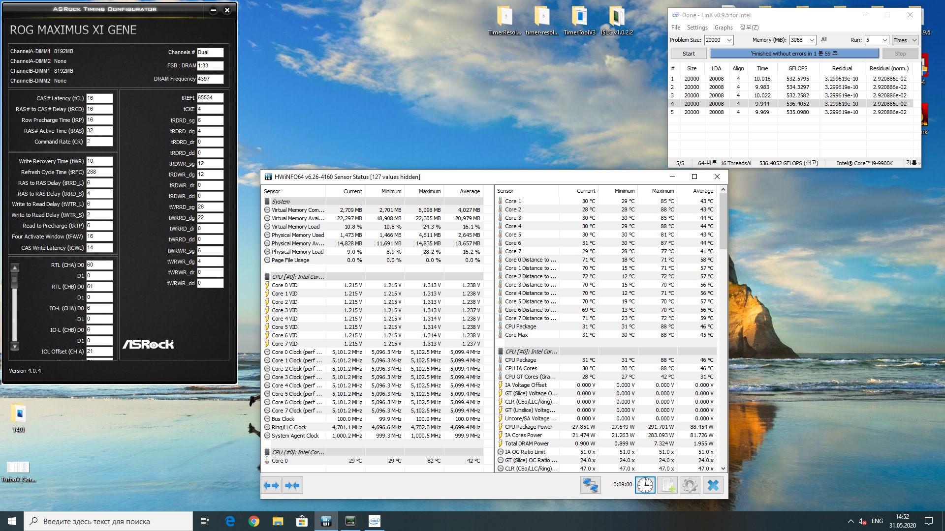 Полученный результат должен иметь следующий вид: Скриншот рабочего стола после прохождения >9 циклов (т.е. между 9 и 10 проходами). Вместе с LinX на рабочем столе должны быть развернуты CPU-Z (первая вкладка) и Core Temp, это обязательный минимум. Такой набор программ даст информацию о напряжении и температурах под нагрузкой-простоем. По желанию можете добавить другие программы, показывающие дополнительную информацию о вашей системе, например третью вкладку CPU-Z, которая покажет модель материнской платы и версию BIOS. Пример результата разгона: Mad Max, 5100 МГц (AVX 0), i7-8086K, HT-ON, Cache 4700, Vcore=1.36V, Batch L805E123, Gigabyte Z370 Aorus Gaming 7 (bios F6), Be Quiet! Dark Rock Pro 4, ЖМ под HS, Windows 10 Pro 64-bit 1809, LinX 0.9.3 64bit.