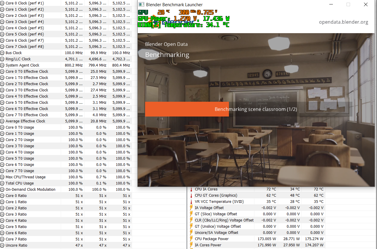 Потребление в блендере развивается сильно меньшее, нежели в Prime non-AVX, а, самое главное - там нет контроля ошибок. В Прайме между началом регистрации ошибок и системным фейлом - пропасть. В результате, на стабильной в блендере системе может вылетать, например, Батлфилд или Овервотч. Блендер не годится, как критерий стабильности. Да и какой смысл в этих исканиях, когда есть Прайм, который может давать нагрузку любого характера и интенсивности и тестировать что угодно, за исключением видеокарты.