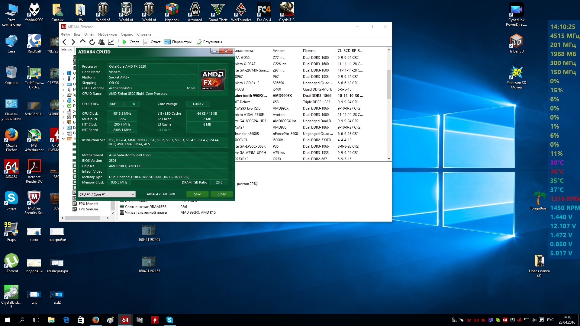 Достоинства: Обновил платформу еще летом 2014г, мать+проц+память. AMD FX-8320, 4000 MHz (20×200/1.4v)(CPUNB/2400) DeepCool Iceedge 400fs(2 вертушки+arctic-mx2)Gigabyte GA-970A-DS3P(на питальник и северник поставил куллер)Team Group Dark-1600 2×4GB(2133/12-12-12-32/1.65v) Немного жалею что материнку взял с слабой системой питания 4+1 фазы и без поддержки sli. Поэтому «стабильный» разгон в моем случае заканчивается на 4000 по процу и 2400Mhz по контроллеру памяти. Стартует и работает на 4.5Ghz при напряжении 1.5v, но как только даешь «копоти» рендер видео в вегасе или линпак, минуты через 2-3 система уходит в bsod, проще говоря не стабильно. Поэтому не повторяйте моих ошибок, для такого проца нужна мать с питальником 8+1 не меньше т.к камень способен работать на частотах 4500-4700Mhz. Ps: добавил результаты бенчмарка aidы и linx Недостатки Энергопотребление, но опять же с включенными технологиями энергосбережения cool&quiet, c6state, apm и.т.п в простое понижается напряжение до 0.9v таким образом множитель ядер снижается до x7 и частота процессора составляет 1400Mhz. Поэтому в простоте энергопотребление минимальное. Более того, включение и отключение энергосберегающих опций в биосе никак не сказывается на разгоночном потенциале и производительности в целом. Проверенно опытным путем.Как пользователь данного камня, с уверенностью могу заявить что его производительности еще хватит на год ну максимум два. Но сейчас собирать систему на данном ЦП — не целесообразно, т.к платформа AM3+ уже исчерпала себя. Тем более не за горами Zen