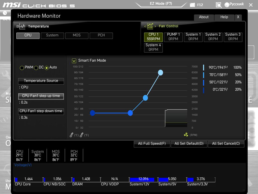 gopnik741 Попробуй вот такую кривую и значения step up time такие. Вентилятор на 4pin? Если не будет корректно работать, попробуй переключить управление в DC Mode. Вообще, такое лучше в теме по матерям спрашивать