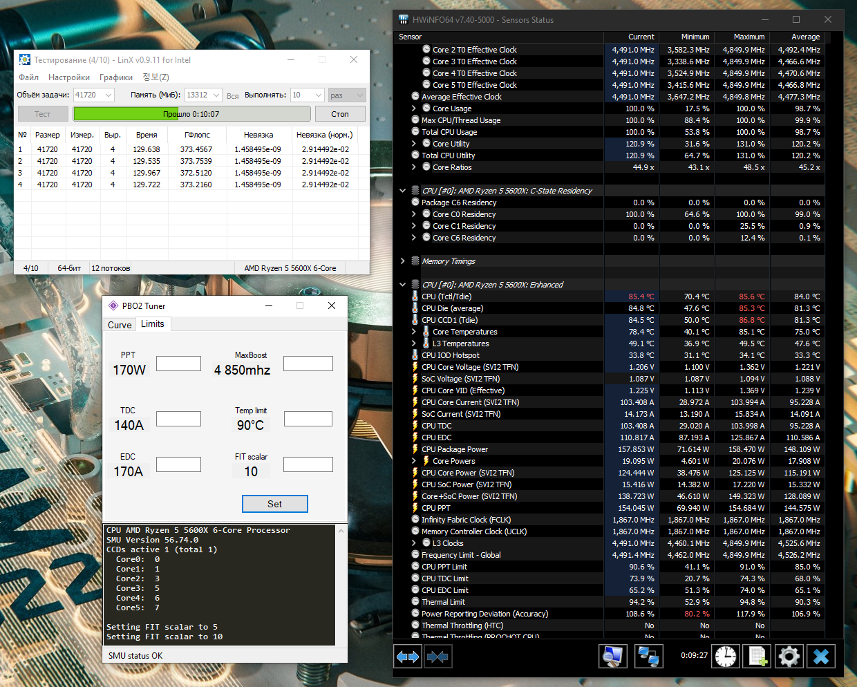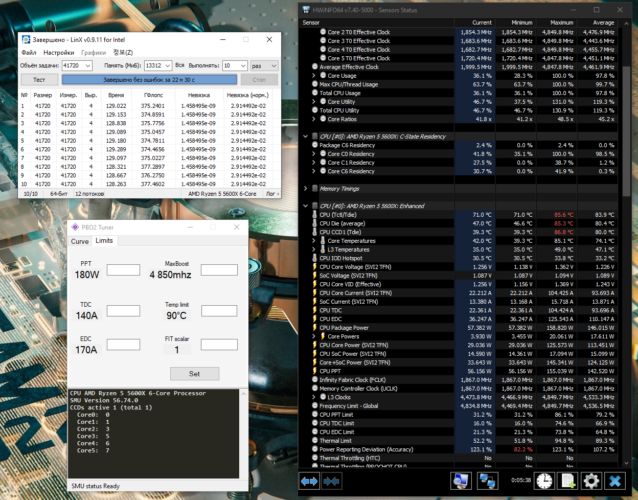 Лично я выставил сразу лимиты по максимуму что может VRM материнки и сколько может переварить охлаждение. Precision Boost Overdrive Scalar чем больше значение, тем позже и менее агрессивно процессор сбрасывает частоты после того как пропала нагрузка. Выставил на максимум. Что касается Load-Line Calibration то для всего кроме VCore выставляю в самое агрессивные значения, хотя и для VCore тоже. Precision Boost берёт во внимание показания именно мониторинга, а не запрашиваемое значение. Мониторинг материнской платы читается Precision Boost`ом через такой протокол как SVI2 TFN. Технология заключается в следующем: 1)выставляем Желаемый VCore Offset, если выставляем его в сторону увеличения, то малопоточная производительность будет выше, если в сторону уменьшения то многопоточная производительность будет выше. Под каждую настройку VCore Offset надо подправлять значения Curve Optimizer, 2)сначала для всех ядер уменьшаем Curve Optimizer, 3)запускаем скрипт, упомянутый выше, повторяем шаг номер 2, пока ни начнёт вываливаться ошибка на одном или нескольких ядрах и откатываемся на один шаг 4)запускаем после этого Cinebench R20, с большой вероятностью система просто перезагрузится, это по большей части лечится добавлением CPU PLL напряжения с 1,8V, но не превышая 1,9V, хотя от чрезмерного напряжения PLL может начаться обратный эффект и стабильность пропадёт, 5)далее начинаем настраивать Curve Optimizer для каждого ядра отдельно и проверяем стабильность как в шагах 3-4.