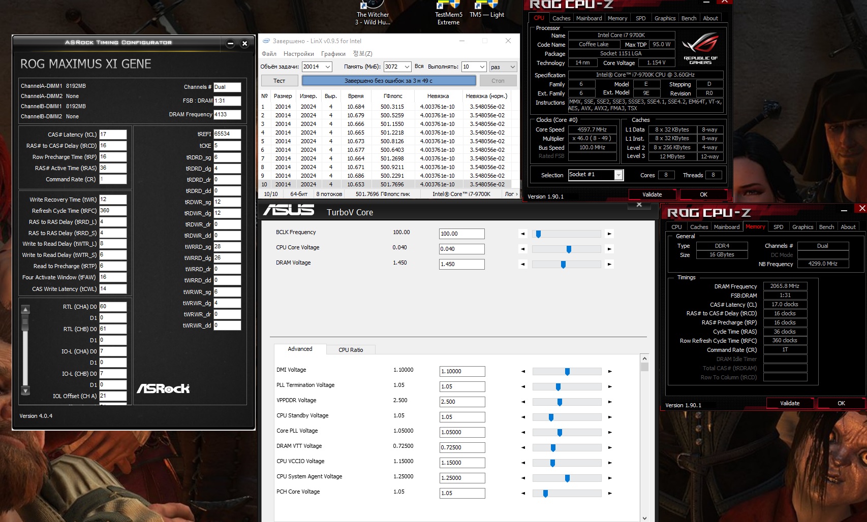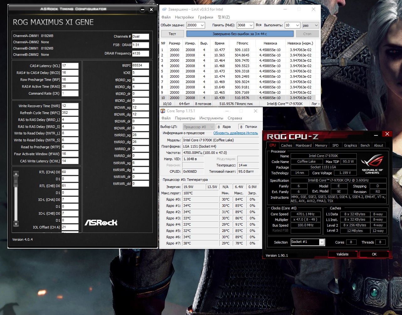 Полученный результат должен иметь следующий вид: Скриншот рабочего стола после прохождения >9 циклов (т.е. между 9 и 10 проходами). Вместе с LinX на рабочем столе должны быть развернуты CPU-Z (первая вкладка) и Core Temp, это обязательный минимум. Такой набор программ даст информацию о напряжении и температурах под нагрузкой-простоем. По желанию можете добавить другие программы, показывающие дополнительную информацию о вашей системе, например третью вкладку CPU-Z, которая покажет модель материнской платы и версию BIOS. Пример результата разгона: Mad Max, 5100 МГц (AVX 0), i7-8086K, HT-ON, Cache 4700, Vcore=1.36V, Batch L805E123, Gigabyte Z370 Aorus Gaming 7 (bios F6), Be Quiet! Dark Rock Pro 4, ЖМ под HS, Windows 10 Pro 64-bit 1809, LinX 0.9.3 64bit.