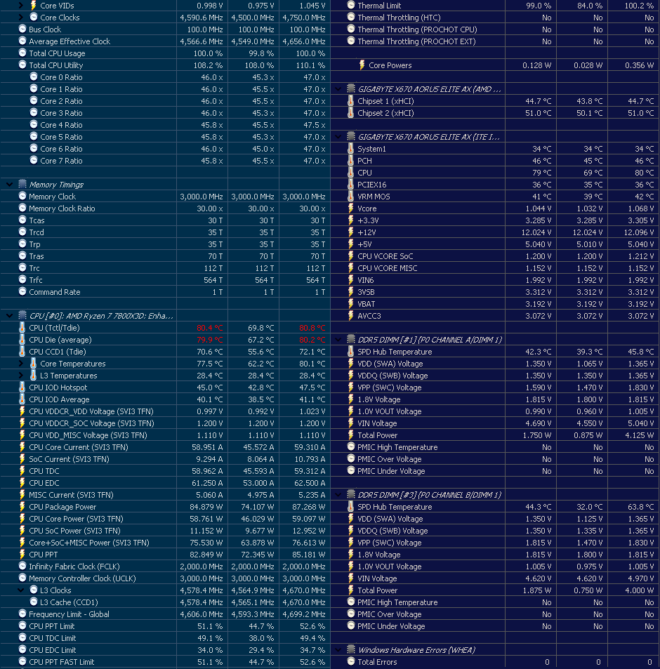 Там фикс 5.4 на 7950х при VID 1.35В и 190Вт потребления и о чудо, максимальная температура в СБ23 82.5С - вообще жуткий скрин, почему не использовать HWiNFO64?