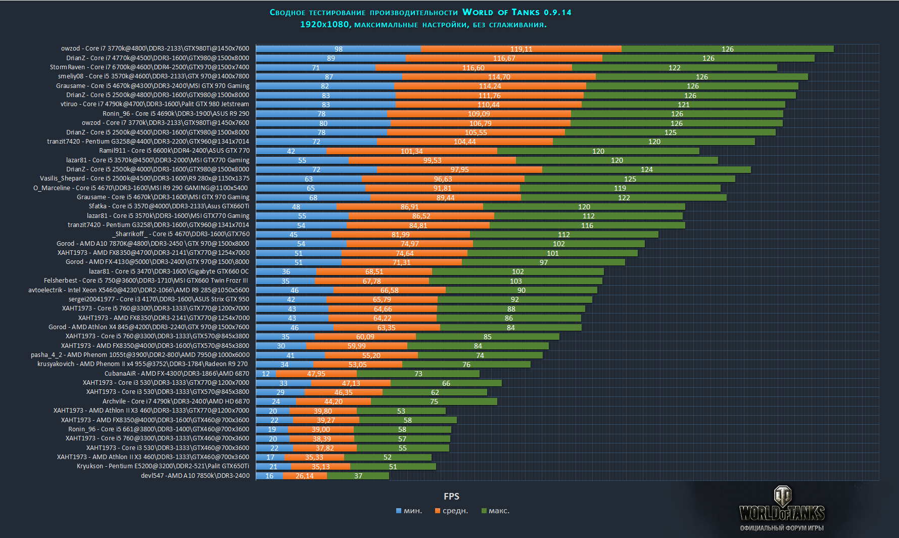 Gorod иногда есть польза от уставленного тестового клиента танков !!! вот прогнал тет же релей что в таблице ,только тут у меня видео без разгона 918\5500 против там с зионом 1050\5600 2016-04-24 22:04:31 - WorldOfTanks Frames: 20193 - Time: 300000ms - Avg: 67.310 - Min: 44 - Max: 92