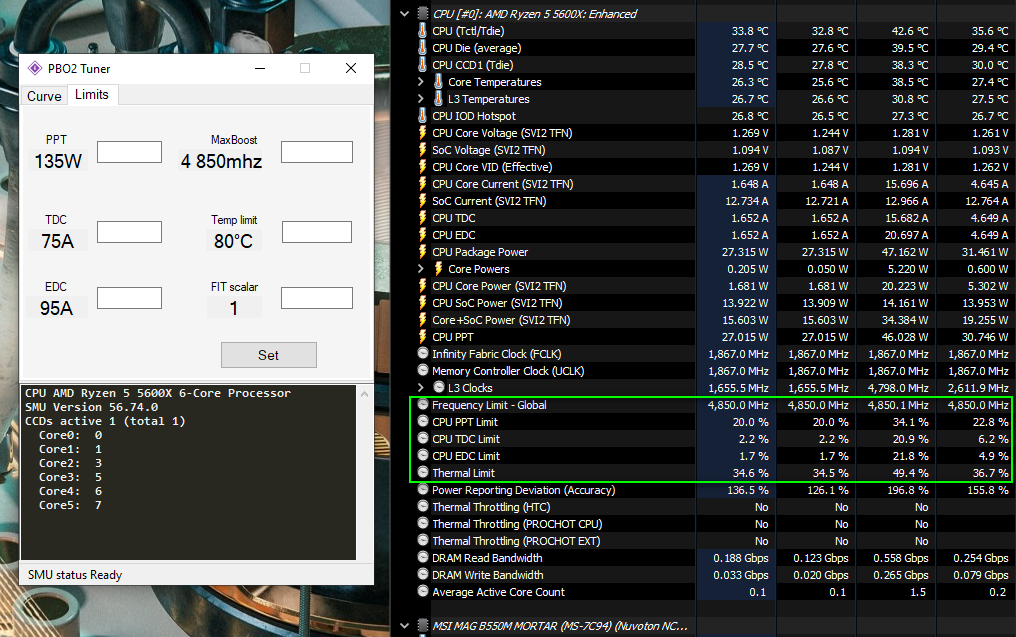 При этом методе игнорируется лимит EDC, лимит TDC настраивается исходя из возможностей VRM, какой ток в амперах материнская плата может максимально выдать не перегревая VRM, лимит PPT это максимальное потребление процессора, особенно актуально если система охлаждения очень инертная. 5900X/5950X упрутся в температурный лимит в 90°С на самом горячем CCD, 5600X/5800X в 95°С, эти значения можно уменьшить при помощи настройки Platform Thermal Throttle Limit. Последние 5°С до этого лимита дают приличные пенальти к бусту.