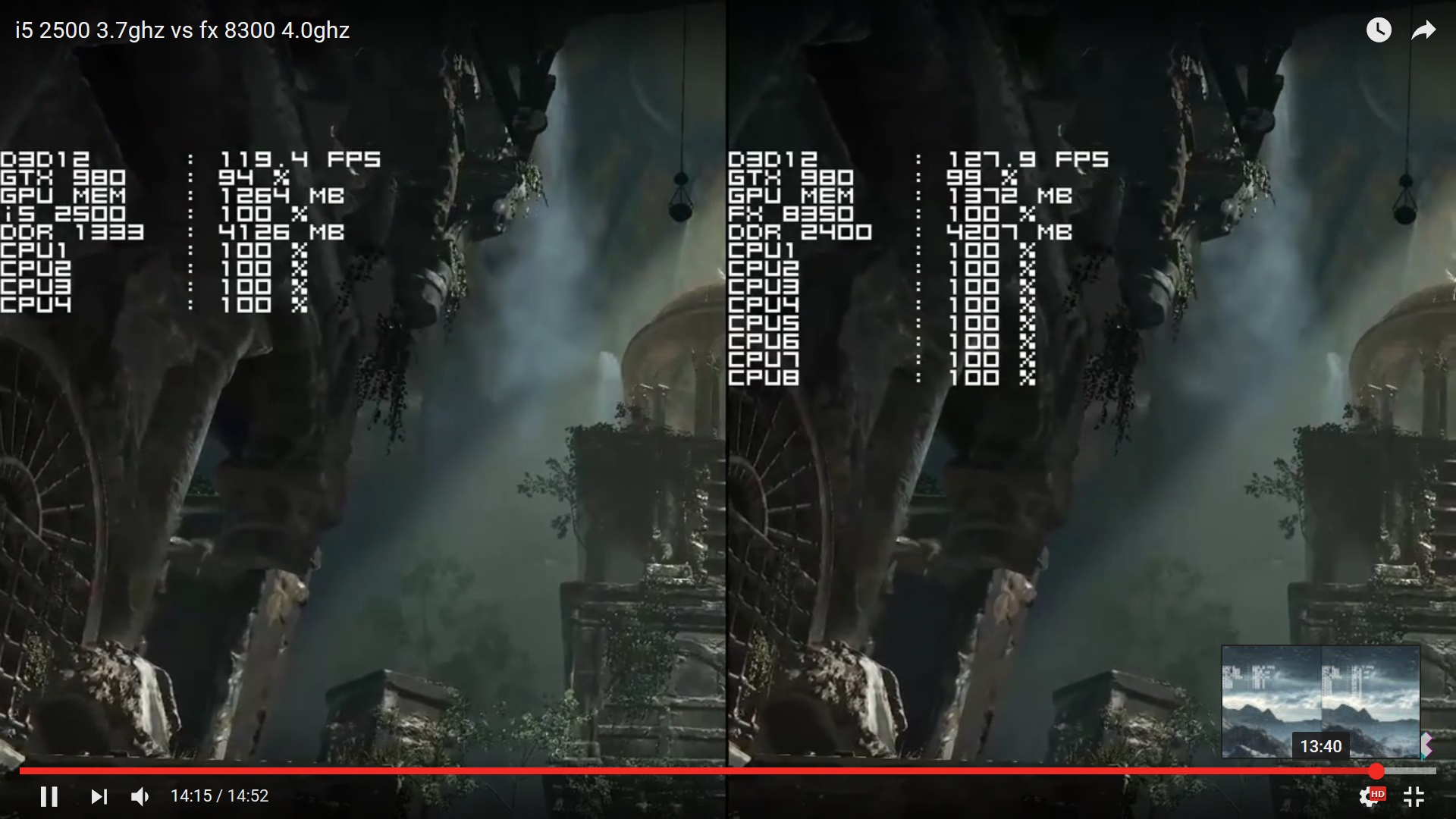 ,естественно у ф икса редко на мин настройках 100% а вот и5 практически всегда вот само видео ,не забудьте спасибо автору за проделанную работу https://www.youtube.com/watch?v=M8Qm_vMsxik и заметьте на 4х потоках частенько фризит ....