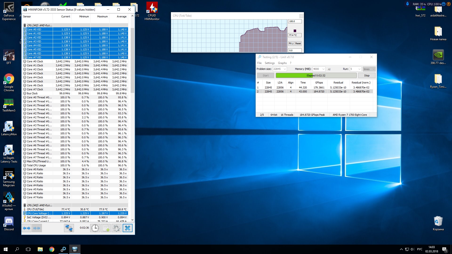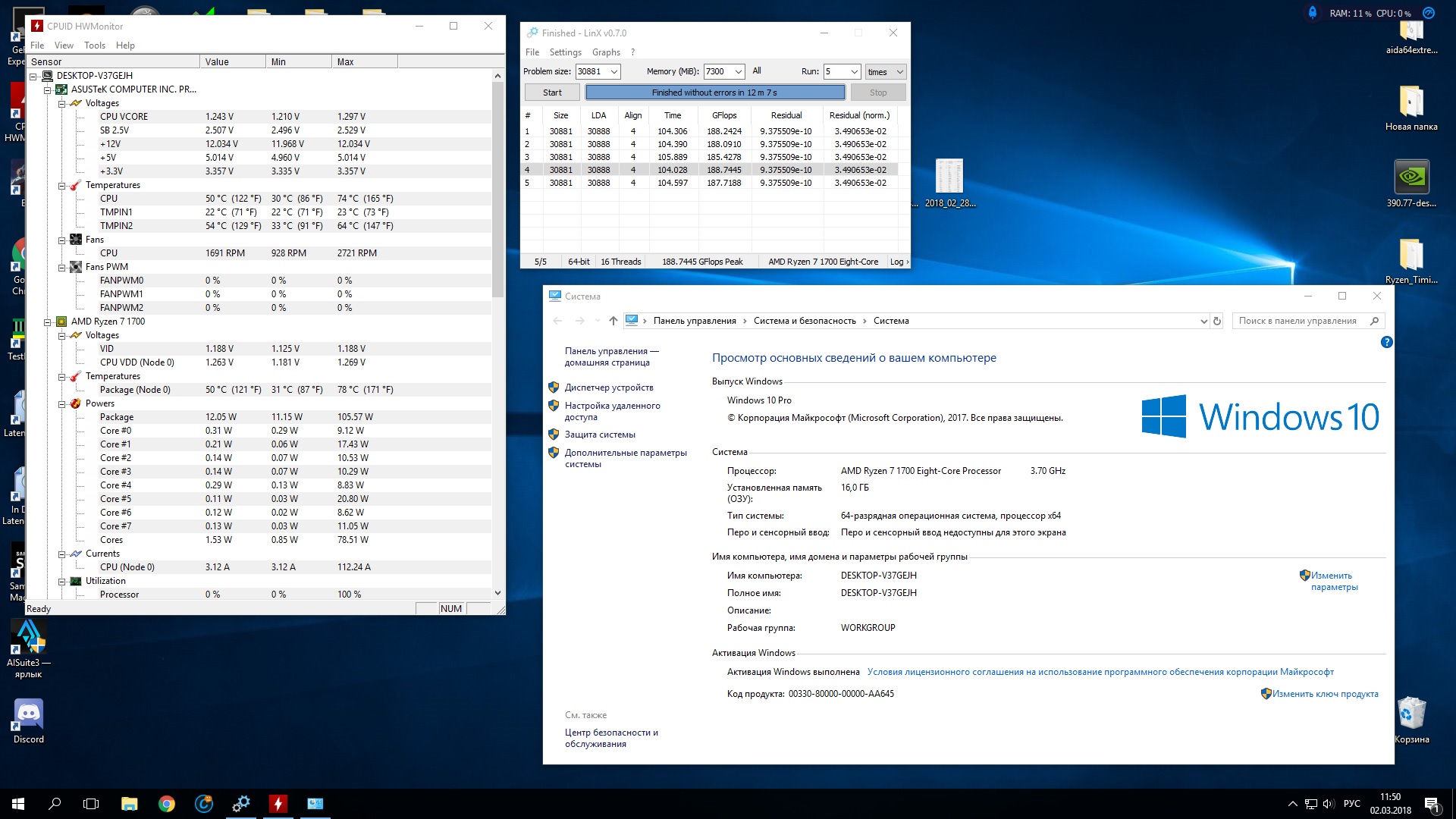 - Обычно поставляется в небольшой коробке без СО. - Штатно имеет базовую частоту 3.4ГГц, частоту 3.5ГГц (технология Turbo Boost) при обычной многопоточной нагрузке (Blender n-cores render) и 3.9ГГц (технологии Precision Boost и XFR) при однопоточной нагрузке (Cinebench R15 single core). - Штатное напряжение питания 1.35В. Может возрастать до 1.4В на отдельных ядрах во время работы Precision Boost и XFR. - Энергоэффективность средняя, требования к СО (TDP) - 95W. Энергопотребление порядка 13Вт в простое и 120Вт в обычной многопоточной нагрузке (Blender n-cores render). - По сравнению с R7 1700 имеет увеличенный промежуток XFR (100МГц вместо 50МГц), а также увеличенные технологией SenseMI показатели температуры на 20 градусов (например, 90 при реальных 70).