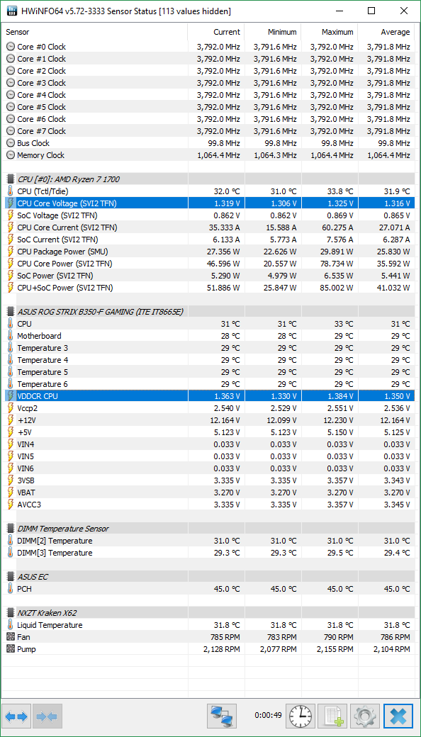 Только Hwinfo и только CPU core voltage в ней покажет истину - текущий вольтаж на процессоре. Остальные программы, и даже БИОС показывают напряжение которое проц запрашивает от мат платы. То-есть вольтаж который запрашивается и вольтаж который получается не равны. И ориентироваться нужно на реальный вольтаж , а не на вольтаж который запрашивается.