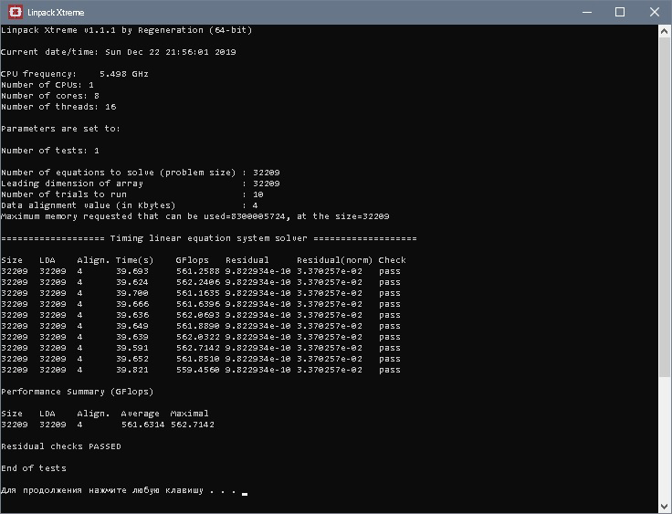 Полученный результат должен иметь следующий вид: Скриншот рабочего стола после прохождения >9 циклов (т.е. между 9 и 10 проходами). Вместе с LinX на рабочем столе должны быть развернуты CPU-Z (первая вкладка) и Core Temp, это обязательный минимум. Такой набор программ даст информацию о напряжении и температурах под нагрузкой-простоем. По желанию можете добавить другие программы, показывающие дополнительную информацию о вашей системе, например третью вкладку CPU-Z, которая покажет модель материнской платы и версию BIOS. Пример результата разгона: Mad Max, 5100 МГц (AVX 0), i7-8086K, HT-ON, Cache 4700, Vcore=1.36V, Batch L805E123, Gigabyte Z370 Aorus Gaming 7 (bios F6), Be Quiet! Dark Rock Pro 4, ЖМ под HS, Windows 10 Pro 64-bit 1809, LinX 0.9.3 64bit.