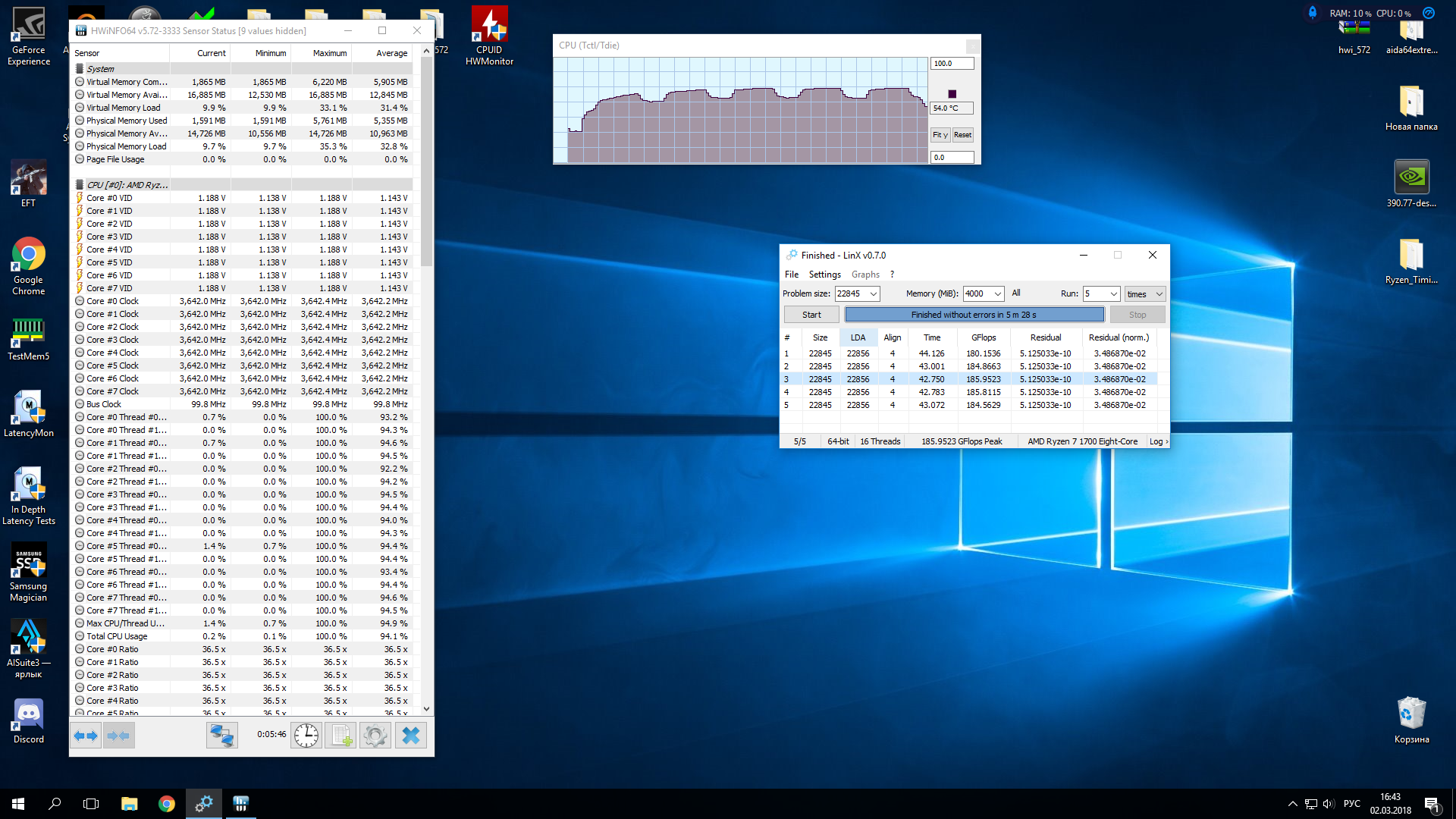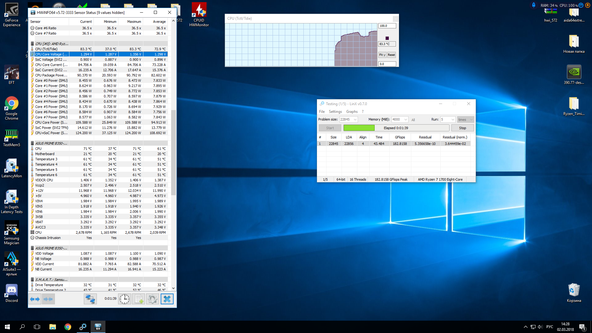 - Обычно поставляется в небольшой коробке без СО. - Штатно имеет базовую частоту 3.4ГГц, частоту 3.5ГГц (технология Turbo Boost) при обычной многопоточной нагрузке (Blender n-cores render) и 3.9ГГц (технологии Precision Boost и XFR) при однопоточной нагрузке (Cinebench R15 single core). - Штатное напряжение питания 1.35В. Может возрастать до 1.4В на отдельных ядрах во время работы Precision Boost и XFR. - Энергоэффективность средняя, требования к СО (TDP) - 95W. Энергопотребление порядка 13Вт в простое и 120Вт в обычной многопоточной нагрузке (Blender n-cores render). - По сравнению с R7 1700 имеет увеличенный промежуток XFR (100МГц вместо 50МГц), а также увеличенные технологией SenseMI показатели температуры на 20 градусов (например, 90 при реальных 70).
