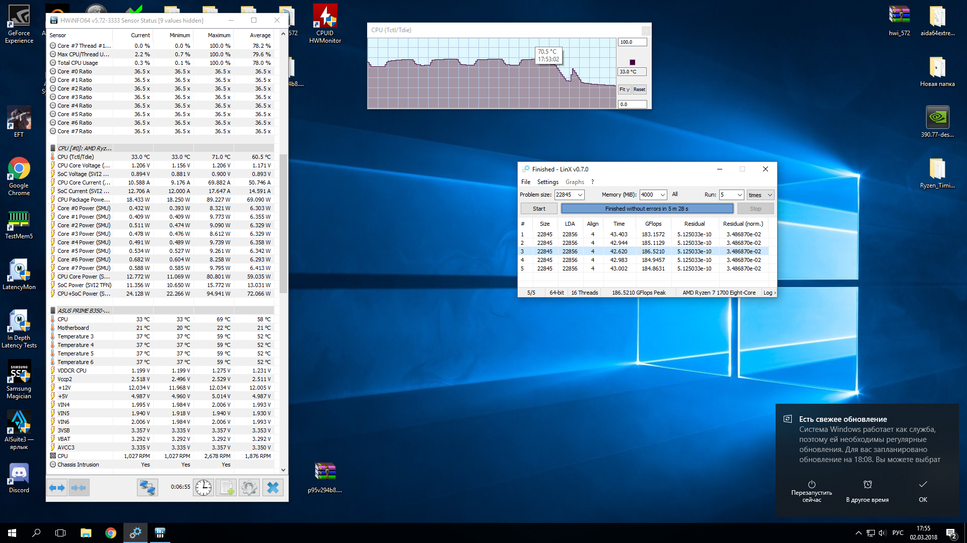 Стандартной системы охлаждения R7 1700 хватит даже на небольшой разгон, но лучше всё таки раздобыть что-то с тепловыми трубками. Если ваша старая СО она крепилась к AM3 не зацепками, а винтами, то без помощи производителя, похода в магазин (если вообще бывают такие магазины, где продают комплекты креплений для СО) или колхоза вы её на AM4 не приткнёте. Зато если были зацепки, то проблем быть не должно. Если вы решили брать новое СО, то обратите особое внимание на совместимость с AM4 конкретного выбранного вами экземпляра в магазине, т.к. даже если на сайте производителя написано, что они, например, поставляют с креплением для AM4 в комплекте, у магазина может быть запас ещё с тех времён, когда они поставляли без такого крепления, и потом вам останется только просить у магазина принять товар обратно (что магазины очень не любят делать, особенно если вы его распаковали). Рабочей на Ryzen является температура до 75 градусов (реальных, а не с оффсетом SenseMI). При перегреве процессор сначала снижает множители на конкретных ядрах (некоторые называют это "троттлинг"), если это не помогает, система выключается и может не включаться, пока он не остынет, или выдавать ошибку о перегреве при загрузке (видел оба случая, но не уверен как это точно работает).