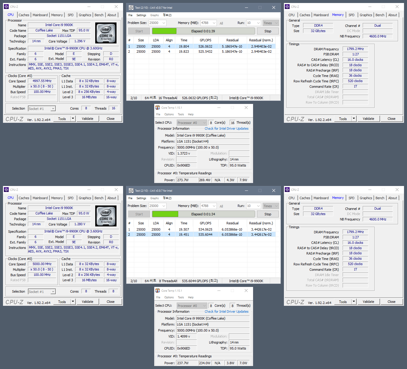 Полученный результат должен иметь следующий вид: Скриншот рабочего стола после прохождения >9 циклов (т.е. между 9 и 10 проходами). Вместе с LinX на рабочем столе должны быть развернуты CPU-Z (первая вкладка) и Core Temp, это обязательный минимум. Такой набор программ даст информацию о напряжении и температурах под нагрузкой-простоем. По желанию можете добавить другие программы, показывающие дополнительную информацию о вашей системе, например третью вкладку CPU-Z, которая покажет модель материнской платы и версию BIOS. Пример результата разгона: Mad Max, 5100 МГц (AVX 0), i7-8086K, HT-ON, Cache 4700, Vcore=1.36V, Batch L805E123, Gigabyte Z370 Aorus Gaming 7 (bios F6), Be Quiet! Dark Rock Pro 4, ЖМ под HS, Windows 10 Pro 64-bit 1809, LinX 0.9.3 64bit.