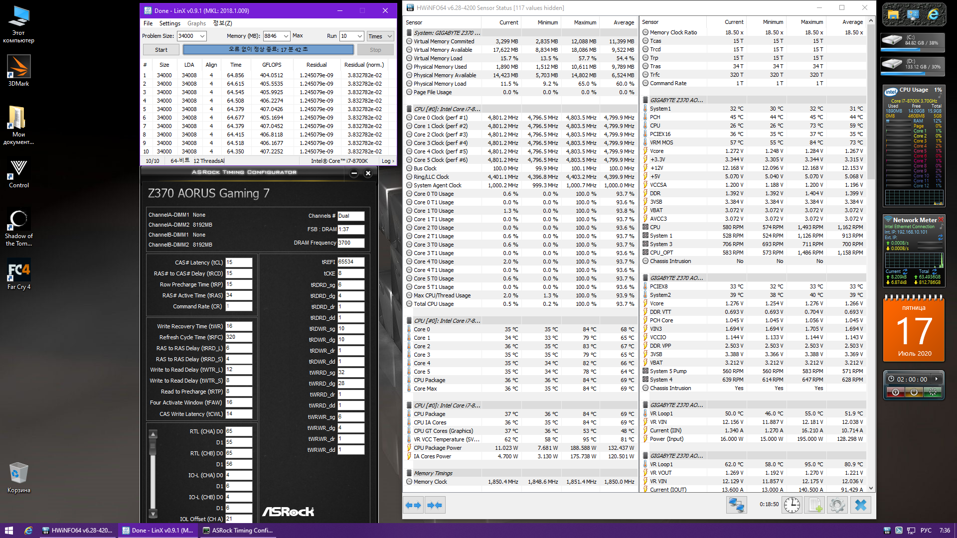 Полученный результат должен иметь следующий вид: Скриншот рабочего стола после прохождения >9 циклов (т.е. между 9 и 10 проходами). Вместе с LinX на рабочем столе должны быть развернуты CPU-Z (первая вкладка) и Core Temp, это обязательный минимум. Такой набор программ даст информацию о напряжении и температурах под нагрузкой-простоем. По желанию можете добавить другие программы, показывающие дополнительную информацию о вашей системе, например третью вкладку CPU-Z, которая покажет модель материнской платы и версию BIOS. Пример результата разгона: Mad Max, 5100 МГц (AVX 0), i7-8086K, HT-ON, Cache 4700, Vcore=1.36V, Batch L805E123, Gigabyte Z370 Aorus Gaming 7 (bios F6), Be Quiet! Dark Rock Pro 4, ЖМ под HS, Windows 10 Pro 64-bit 1809, LinX 0.9.3 64bit.