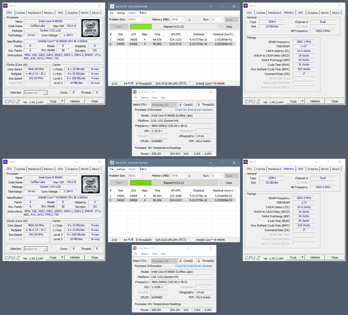 Полученный результат должен иметь следующий вид: Скриншот рабочего стола после прохождения >9 циклов (т.е. между 9 и 10 проходами). Вместе с LinX на рабочем столе должны быть развернуты CPU-Z (первая вкладка) и Core Temp, это обязательный минимум. Такой набор программ даст информацию о напряжении и температурах под нагрузкой-простоем. По желанию можете добавить другие программы, показывающие дополнительную информацию о вашей системе, например третью вкладку CPU-Z, которая покажет модель материнской платы и версию BIOS. Пример результата разгона: Mad Max, 5100 МГц (AVX 0), i7-8086K, HT-ON, Cache 4700, Vcore=1.36V, Batch L805E123, Gigabyte Z370 Aorus Gaming 7 (bios F6), Be Quiet! Dark Rock Pro 4, ЖМ под HS, Windows 10 Pro 64-bit 1809, LinX 0.9.3 64bit.