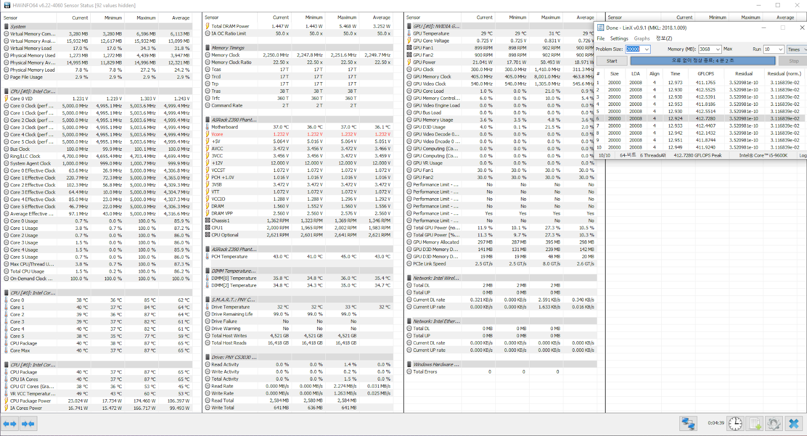 Полученный результат должен иметь следующий вид: Скриншот рабочего стола после прохождения >9 циклов (т.е. между 9 и 10 проходами). Вместе с LinX на рабочем столе должны быть развернуты CPU-Z (первая вкладка) и Core Temp, это обязательный минимум. Такой набор программ даст информацию о напряжении и температурах под нагрузкой-простоем. По желанию можете добавить другие программы, показывающие дополнительную информацию о вашей системе, например третью вкладку CPU-Z, которая покажет модель материнской платы и версию BIOS. Пример результата разгона: Mad Max, 5100 МГц (AVX 0), i7-8086K, HT-ON, Cache 4700, Vcore=1.36V, Batch L805E123, Gigabyte Z370 Aorus Gaming 7 (bios F6), Be Quiet! Dark Rock Pro 4, ЖМ под HS, Windows 10 Pro 64-bit 1809, LinX 0.9.3 64bit.