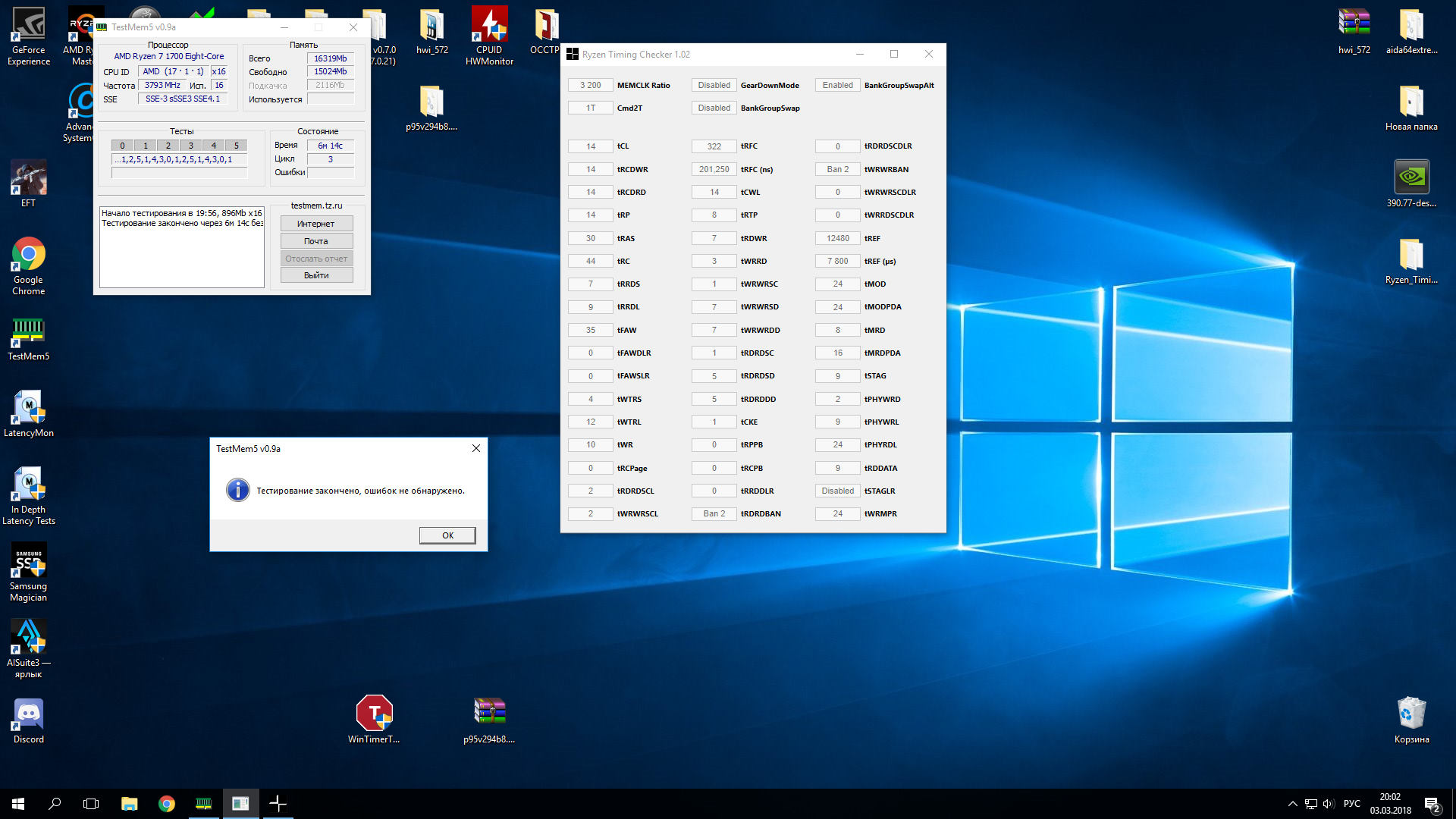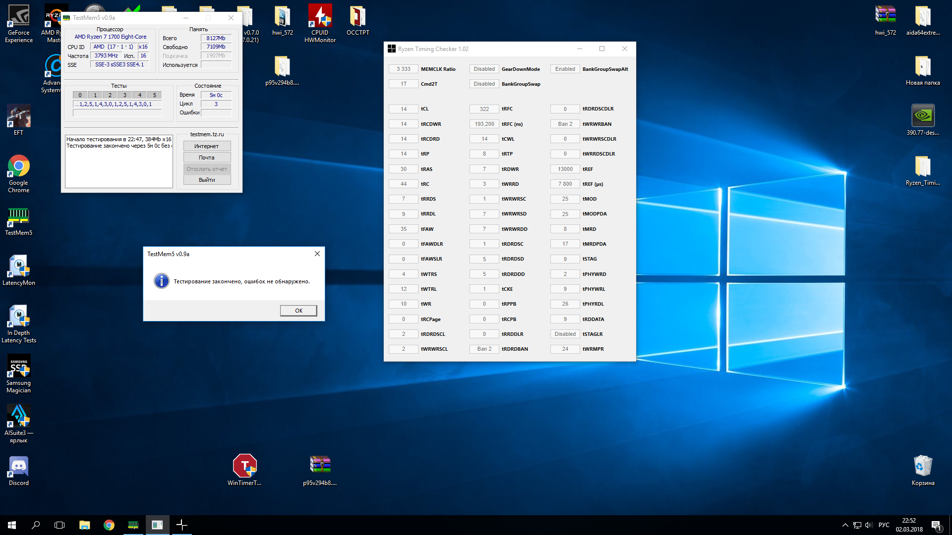 Добрый вечер. Сейчас будет поэма блин... Вчера разогнал проц (Через множитель, а не FID/DID, не вспомню через кого отключается всякая встроенная в райзены мудотень со сберегайками и прочими технологиями) и попытался прогнать ОЗУ. Начну со вторичных: GDT off, PDE auto, 1T (вчера упорно перескакивало на 2T, хз почему-зачем, задолбался возвращать, не так просто вышло), Proc 53.3, RTT Nom 7. Wr off, Park 5. CAD Bus все на 20, CLDO auto. LLC SOC стояла на Medium, CPU Medium. Теперь основное: vDRAM 1.375, vSOC 1.025, VPP_MEM 2.50 фиксированно, VTDDR вполовину от vDRAM (0.687(5)). Частота изначально была выставлена в 3333МГц. Запуск сразу прошел удачно, ТМ5 в трех прогонах не выявил ошибок, RunMemTest не провел, горело проверить в игре, запустил свой любимый Escape From Tarkov, часика 2 было все отлично, потом подъехали фризы (По секрету они перманентно в этой игре, но эти были другими фризами, нештатными)), решил ради интереса вырубить подкачку, и тут началось...пк не запустился, не было пищаний нифига, вырубил через БП, запустился иии висит в активе одна плашка ОЗУ 0_0. Вынул-вставил -- та же байда, переставил и все так же, поменял местами и заработали...планки стояли через одну (так же как и сейчас), номера каналов сказать не смогу сходу. Запустилась система, врубил снова подкачку и пошел спать. Просыпаюсь сегодня, после старта ОС врубаю тм5 и просто сходу 60+ ошибок. Иду в биос, понижаю частоту до 3200 и в тм5 без ошибок. RunMemtest прогнав до 60% выявил в одном из 16ти окон одну ошибку, дальше не стал прогонять ибо уже ясно что я криворукий и нынешние настройки точно не стабильны. Тайминги уже не упомню у кого подсмотрел, вчера скидывали, кажись у Мазика или через калькулятор. Хотелось бы попросить помощи у сведущего человека во всей этой музыке, понимаю что никому не захочется тратить время, но своими силами вряд-ли справлюсь. В МП биос 3803 от 2018/01/26 Вчерашние 3333 с тм5