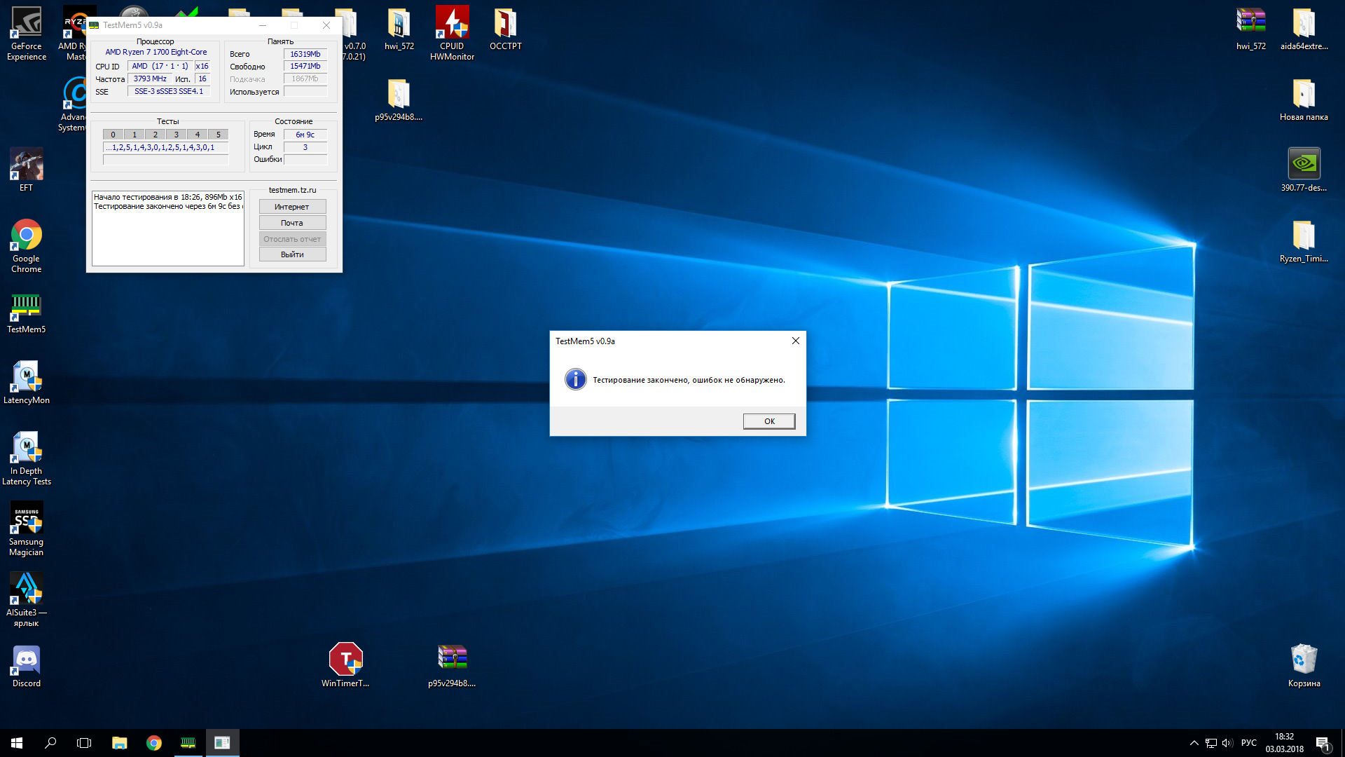 Просыпаюсь сегодня, после старта ОС врубаю тм5 и просто сходу 60+ ошибок. Иду в биос, понижаю частоту до 3200 и в тм5 без ошибок. RunMemtest прогнав до 60% выявил в одном из 16ти окон одну ошибку, дальше не стал прогонять ибо уже ясно что я криворукий и нынешние настройки точно не стабильны. Тайминги уже не упомню у кого подсмотрел, вчера скидывали, кажись у Мазика или через калькулятор. Хотелось бы попросить помощи у сведущего человека во всей этой музыке, понимаю что никому не захочется тратить время, но своими силами вряд-ли справлюсь. В МП биос 3803 от 2018/01/26 Вчерашние 3333 с тм5