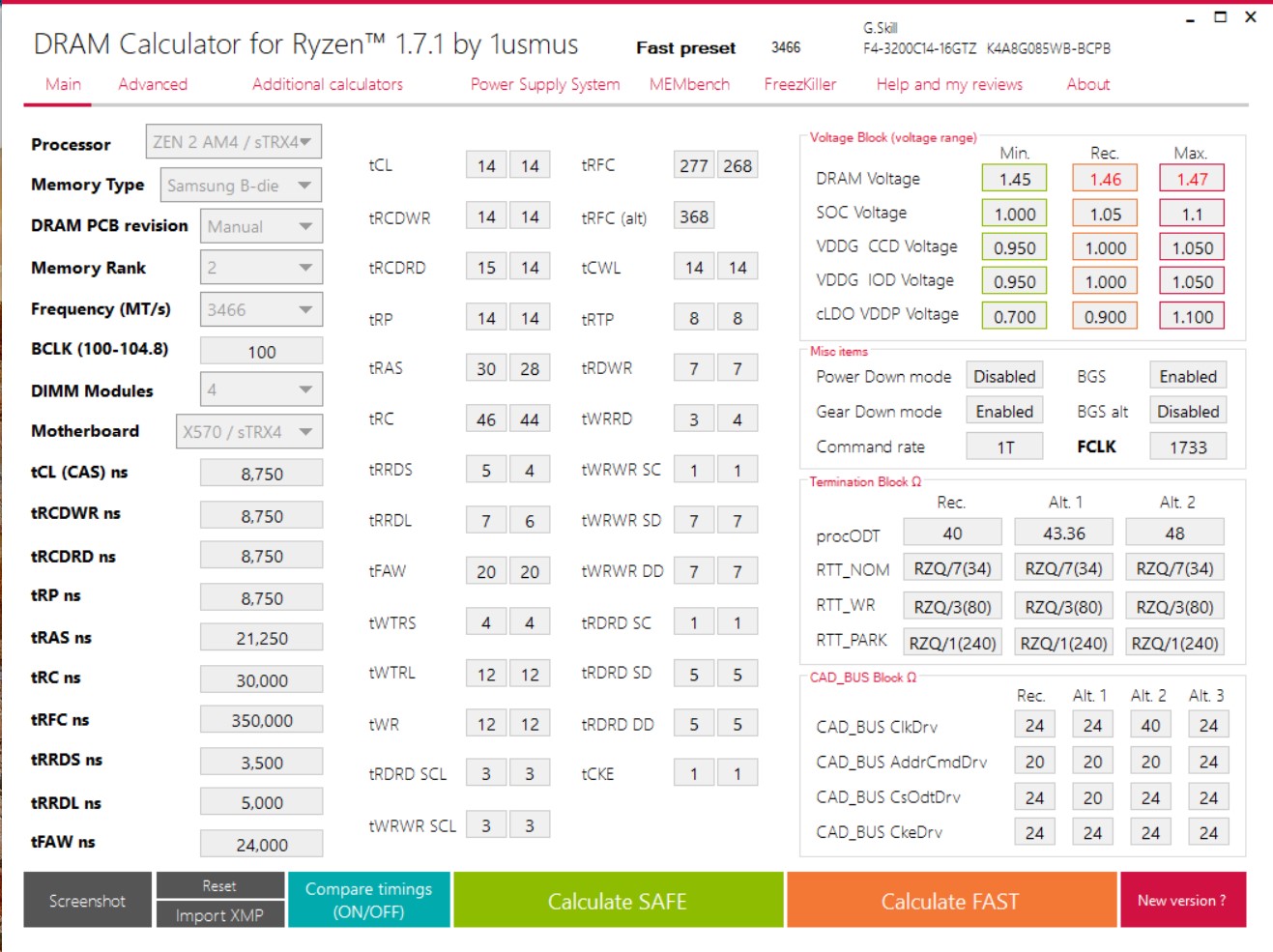 Попробовал запустить фас пресет 3466 по калькулятору - в итоге бсоды, краши и прочее даже при 1,5В, но при этом работает без ошибок на 1,45 если задать тайминги чуть ниже: