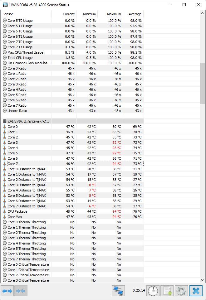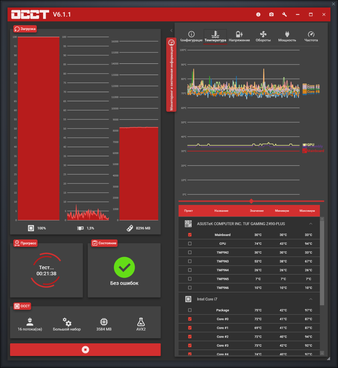 Кто-нибудь подскажет в чём дело? На тестах i7-10700 выдаёт вот такие вот скачки до 92-94 градусов, при средней ТП 75-80. На сколько вообще стоит это брать во внимание? Охлаждение dark rock 4, мать asus tuf gaming z490. Вольтаж на авто (при тесте это было 1.252 мин и 1.350 макс), т.к. если ставить в ручную меньше (1.25 или 1.23), то тест OCCT выдаёт ошибки, при 1.2 - бсод.