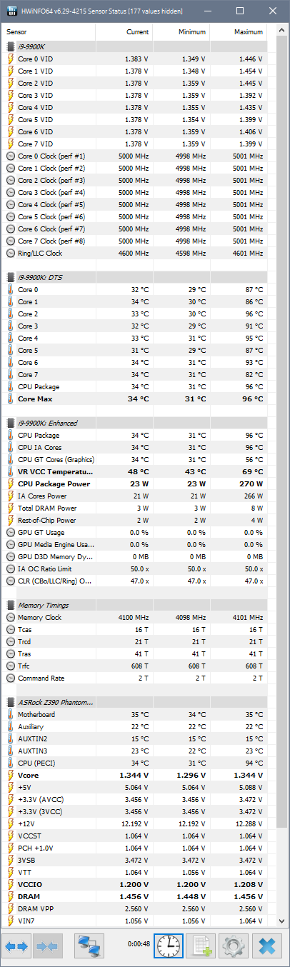 Доброго дня. Есть такая тема, процессор 9700к работает в стоке. Разогнана только память. Отключено пару энергосберегает Intel(R) SpeedStep Technology и С3, С6, С7 из-за чего проц постоянно держит 4.6 - 4.7 что в играх что в стоке. Вот вольтажи интересные, вроде и превышений нет но на общем вольтаже для всех ядер показывает меньше в основном 0.800 - 0.900v А по ядрам там уже скачет и до 1.319v. Но это все постоянно скачет от 1.2 грубо говоря до 1.3, вольтажи на месте не стоят тоже что в простое что в играх постоянно меняются. Я вот думаю может мне зафиксировать и частоту и вольтажи? Ну типа поставить хотя бы 4.7 по всех ядрах и фиксированные вольтажи. Так лучше будет или то что есть сейчас тоже нормально? Ведь вольтаж вроде не скачет до 1.4