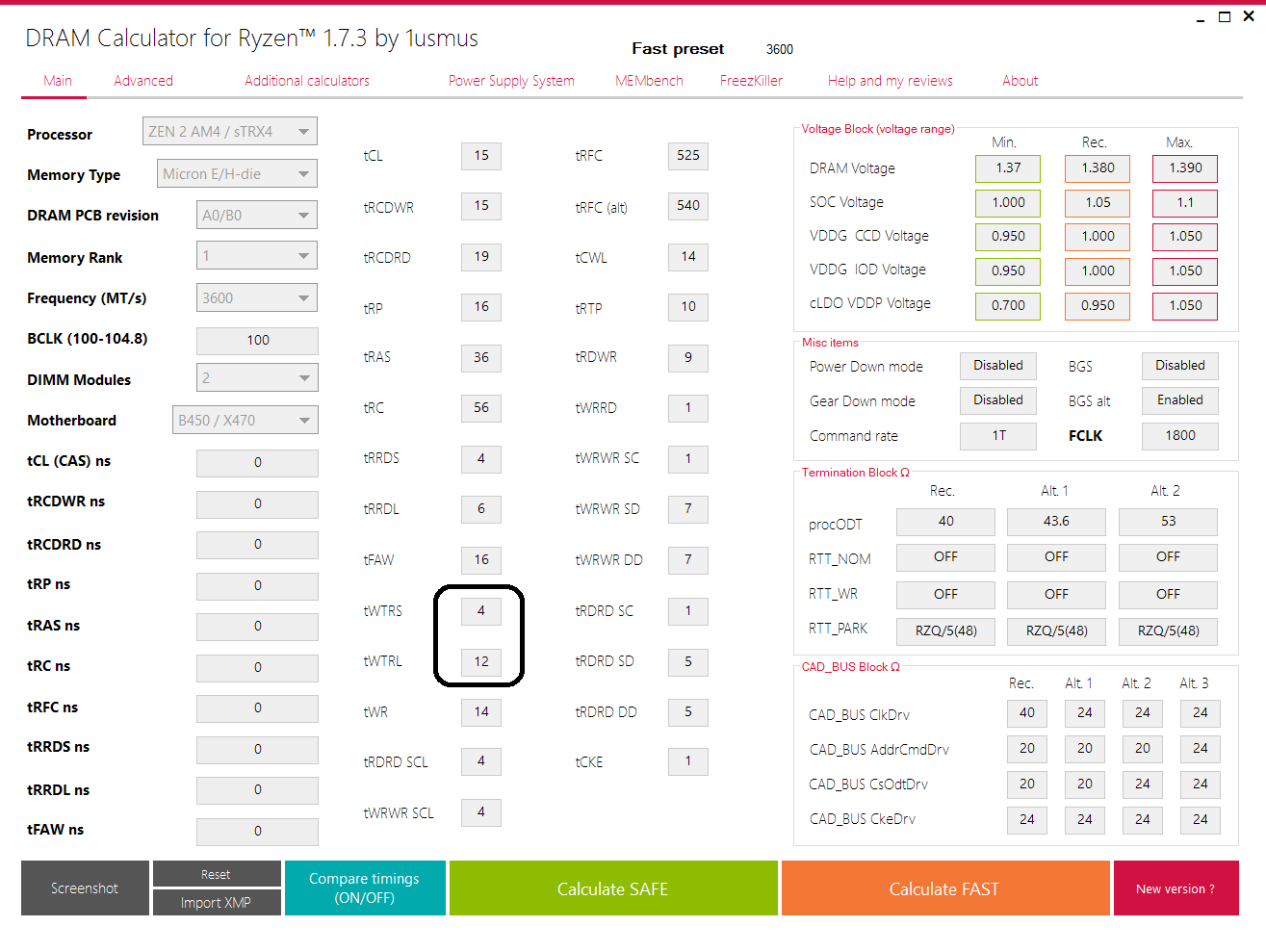 да это скрин с настройками на 3600, пресет встал из калька вроде бы без корректирования, как было так и вбил и поехало, только напряжение рекомендовано 1.38, а у меня ошибки ушли на 1.4, в остальном всё из калька. А вот выше уже хз что крутить.