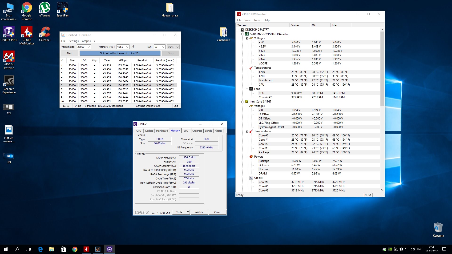 Все, покончил с разгоном, закончил на красивых цифрах 200х20=4 ггц 1.36-.137В, память на микронах на 1.5 вольта все-таки не реально эксплуатировать, взял самсунг 32 гб, пошла на 3200CL16 на 1.35В В линпаке температура под сотню, но в Asus Real Bench крутится в районе 80 (он запускает в фоне рендер, кодирование видео, редактор изображений, грузит кеш и все подряд). В реальных приложениях думаю будет все в рамках рекомендованных минздравом температур, т.е. ниже 80ти. Завтра только руки дойдут до них. А вот скриншот с красивым разгоном. Разброс по ядрам огромный, скальпировать лень, думаю с процом и так все будет хорошо.