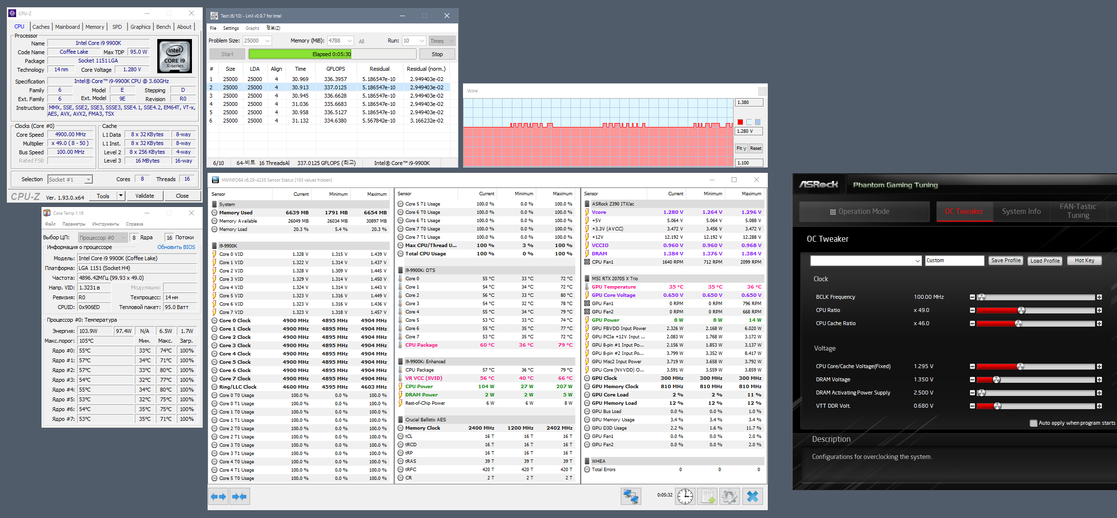 Полученный результат должен иметь следующий вид: Скриншот рабочего стола после прохождения >9 циклов (т.е. между 9 и 10 проходами). Вместе с LinX на рабочем столе должны быть развернуты CPU-Z (первая вкладка) и Core Temp, это обязательный минимум. Такой набор программ даст информацию о напряжении и температурах под нагрузкой-простоем. По желанию можете добавить другие программы, показывающие дополнительную информацию о вашей системе, например третью вкладку CPU-Z, которая покажет модель материнской платы и версию BIOS. Пример результата разгона: Mad Max, 5100 МГц (AVX 0), i7-8086K, HT-ON, Cache 4700, Vcore=1.36V, Batch L805E123, Gigabyte Z370 Aorus Gaming 7 (bios F6), Be Quiet! Dark Rock Pro 4, ЖМ под HS, Windows 10 Pro 64-bit 1809, LinX 0.9.3 64bit.