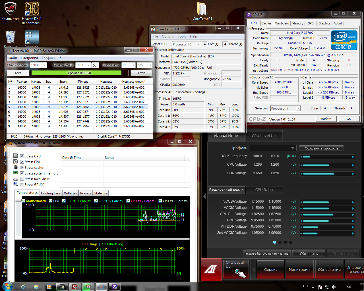 Добавлено спустя 1 час 33 минуты 46 секунд: Как и обещал скрин 4700 на 1.26, все энергосберегайки выключены, HT выключен http://wmmail.ru/misc/4700.png Дальше поднял напряжение до 1.4 и прошел тест на 5 Гц http://wmmail.ru/misc/5000.png учитывая температуру и напряжение тестировать полную стабильность не хочу, проц жалко, 4700 вполне хватит