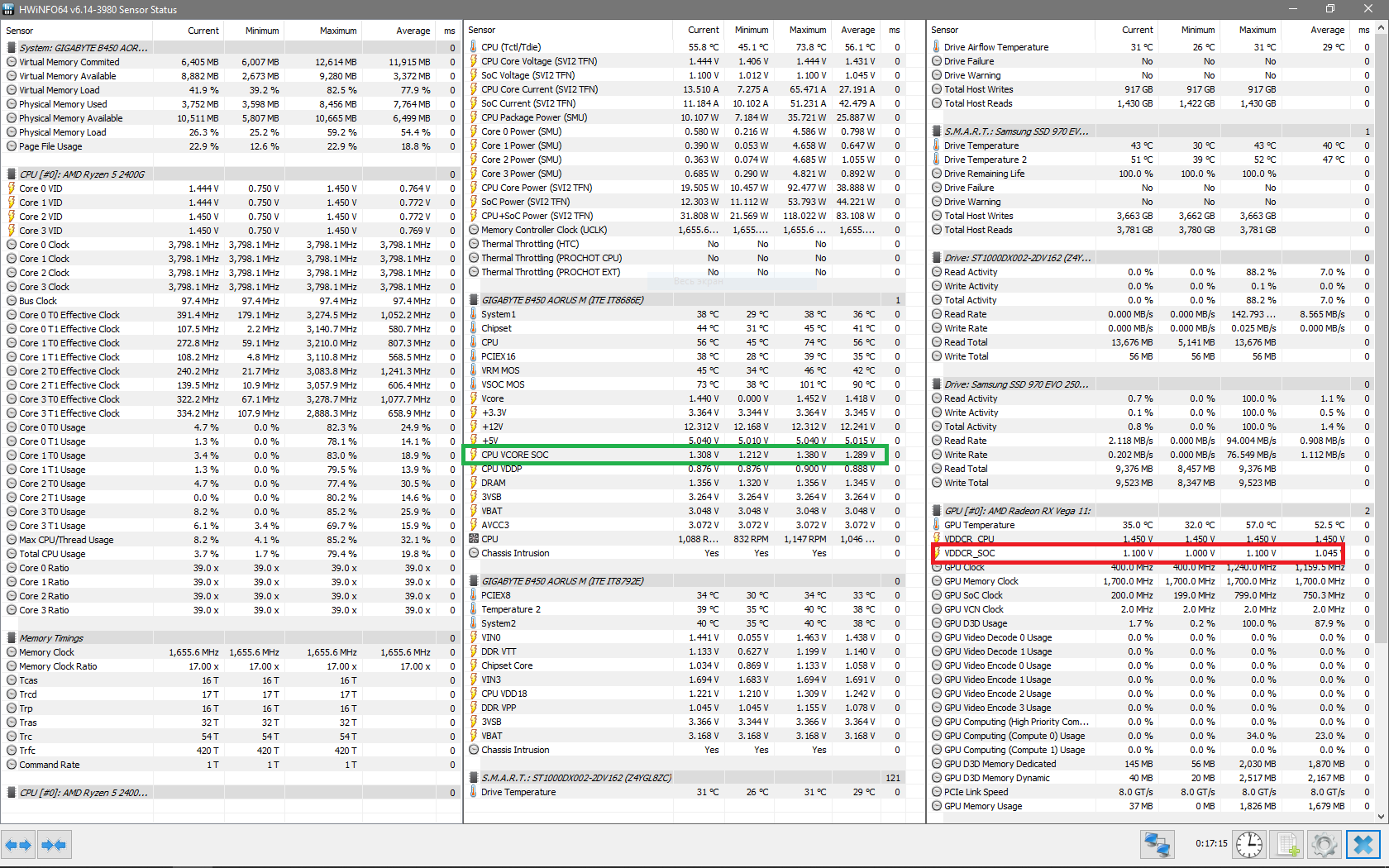 А у тебя мамка может менять зеленое? Вот у меня к примеру SOC это то что красным, но может у тебя зеленый параметр можно как то отдельно менять. Судя по напряжению это какое то среднее для CPU части (которое зеленое), потому что еще со времен первых райзен сок выше 1.2 опасненько поднимать