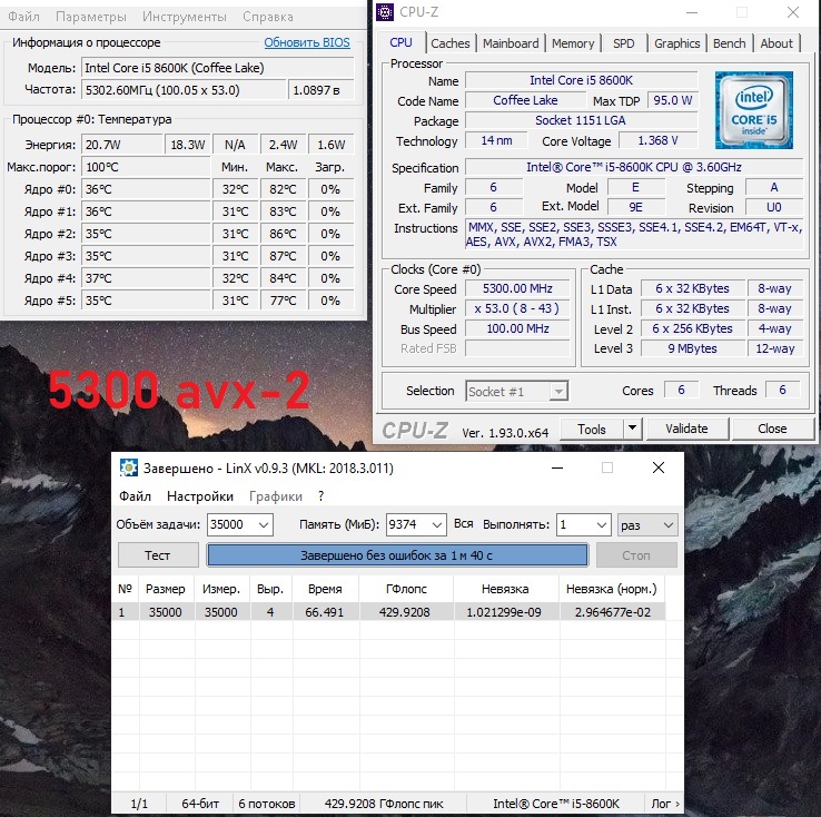 Полученный результат должен иметь следующий вид: Скриншот рабочего стола после прохождения >9 циклов (т.е. между 9 и 10 проходами). Вместе с LinX на рабочем столе должны быть развернуты CPU-Z (первая вкладка) и Core Temp, это обязательный минимум. Такой набор программ даст информацию о напряжении и температурах под нагрузкой-простоем. По желанию можете добавить другие программы, показывающие дополнительную информацию о вашей системе, например третью вкладку CPU-Z, которая покажет модель материнской платы и версию BIOS. Пример результата разгона: Mad Max, 5100 МГц (AVX 0), i7-8086K, HT-ON, Cache 4700, Vcore=1.36V, Batch L805E123, Gigabyte Z370 Aorus Gaming 7 (bios F6), Be Quiet! Dark Rock Pro 4, ЖМ под HS, Windows 10 Pro 64-bit 1809, LinX 0.9.3 64bit.