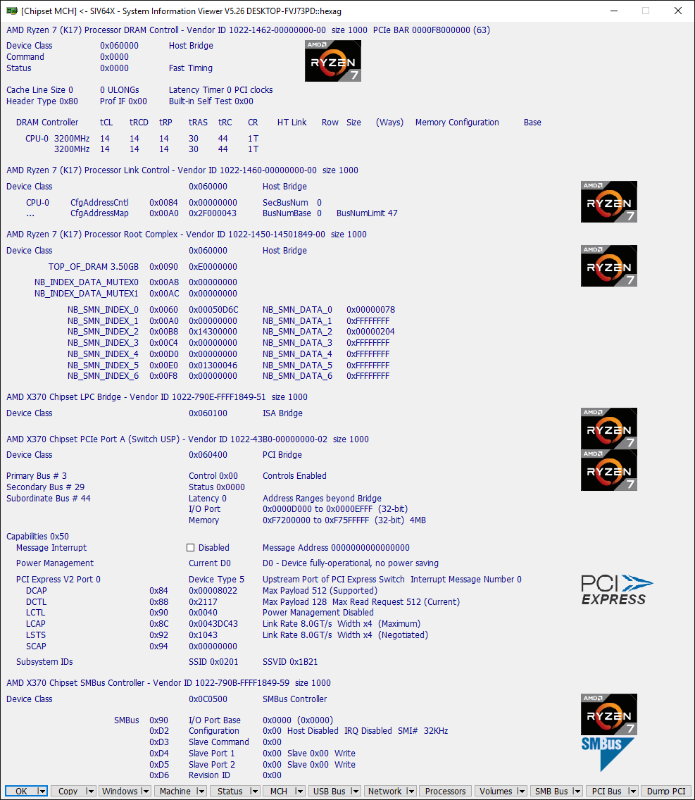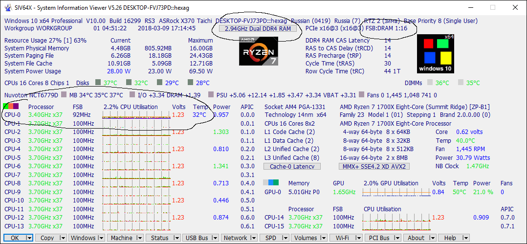 - Обычно поставляется в коробке с системой охлаждения Wraith Spire RGB (это круглая конструкция из целого куска алюминия с медной вставкой-испарительной камерой в основании и вентилятором с кольцом разноцветной подсветки, крепится к задней пластине разъёма AM4 четырьмя винтами). - Штатно имеет базовую частоту 3.0ГГц, частоту 3.2ГГц (технология Turbo Boost) при обычной многопоточной нагрузке (Blender n-cores render) и 3.75ГГц (технологии Precision Boost и XFR) при однопоточной нагрузке (Cinebench R15 single core). - Штатное напряжение питания 1.1875В. Может возрастать до 1.3В на отдельных ядрах во время работы Precision Boost и XFR. - Очень энергоэффективный, требования к СО (TDP) - всего 65W. Энергопотребление порядка 10Вт в простое и 85Вт в обычной многопоточной нагрузке (Blender n-cores render).