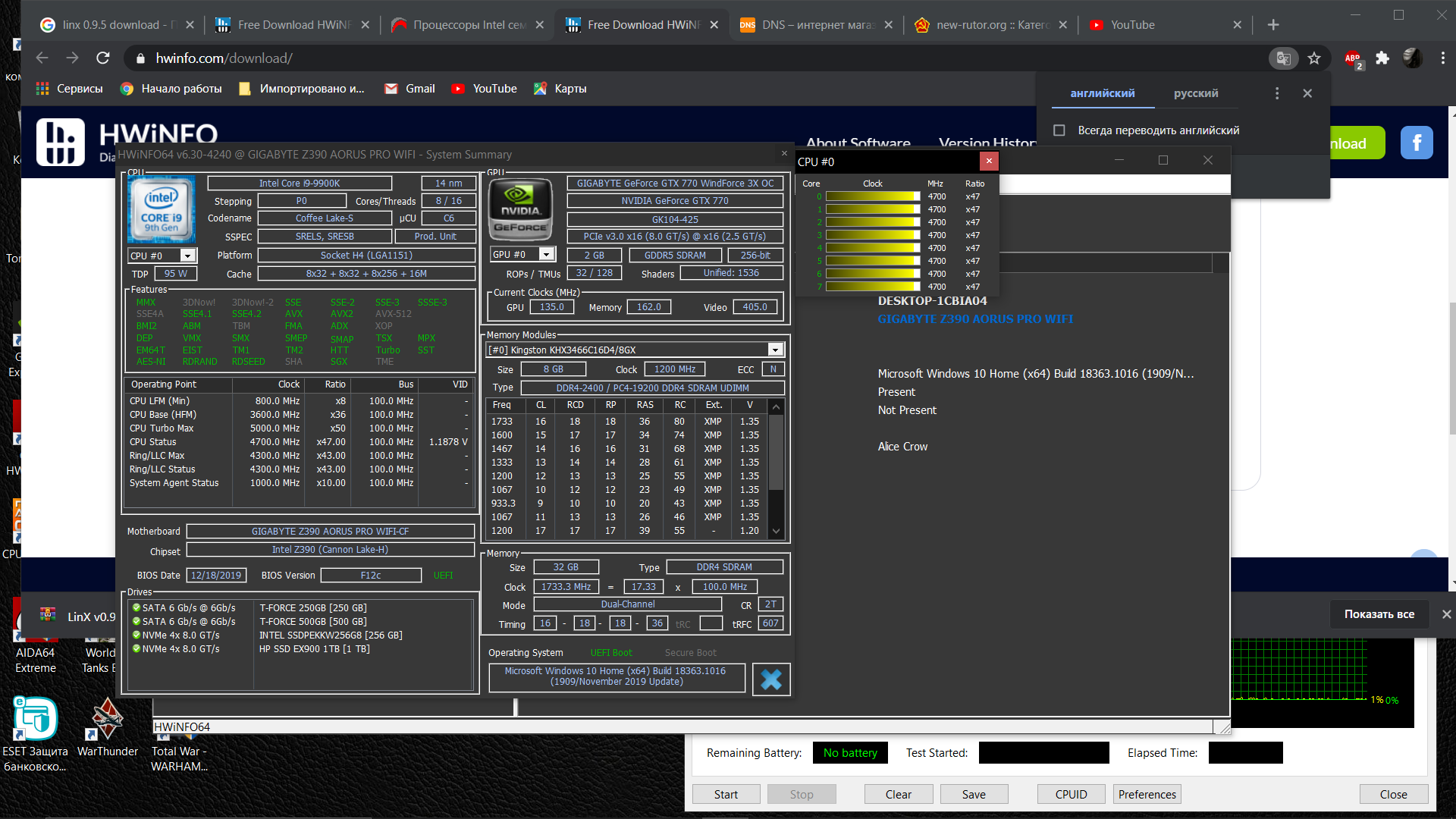 Полученный результат должен иметь следующий вид: Скриншот рабочего стола после прохождения >9 циклов (т.е. между 9 и 10 проходами). Вместе с LinX на рабочем столе должны быть развернуты CPU-Z (первая вкладка) и Core Temp, это обязательный минимум. Такой набор программ даст информацию о напряжении и температурах под нагрузкой-простоем. По желанию можете добавить другие программы, показывающие дополнительную информацию о вашей системе, например третью вкладку CPU-Z, которая покажет модель материнской платы и версию BIOS. Пример результата разгона: Mad Max, 5100 МГц (AVX 0), i7-8086K, HT-ON, Cache 4700, Vcore=1.36V, Batch L805E123, Gigabyte Z370 Aorus Gaming 7 (bios F6), Be Quiet! Dark Rock Pro 4, ЖМ под HS, Windows 10 Pro 64-bit 1809, LinX 0.9.3 64bit.