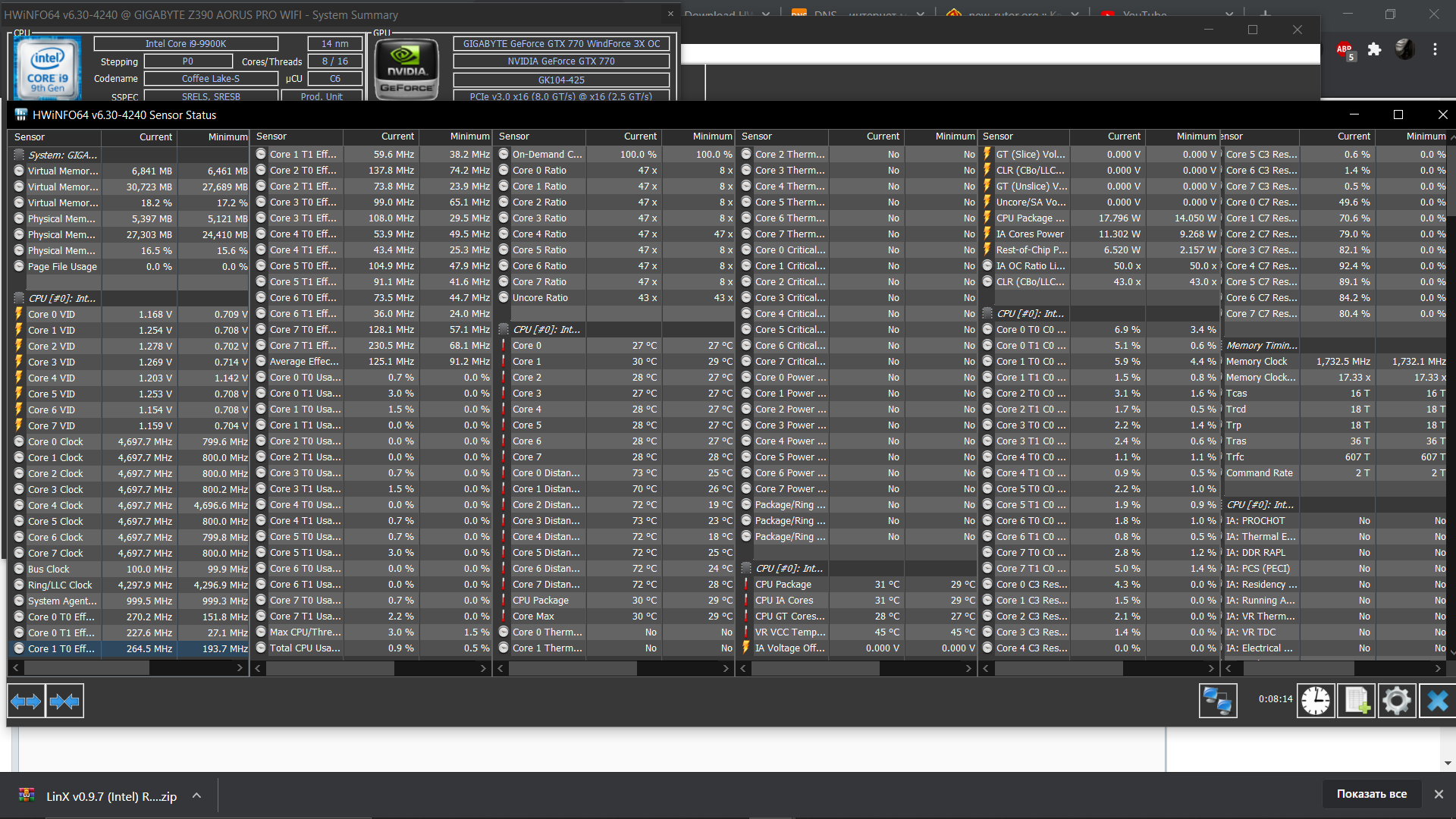 LinX должен быть настроен следующим образом: Задаете режим 32 либо 64 бит, объем задачи = 25000 (не меньше 25000), количество проходов = 10 (не меньше 10).
