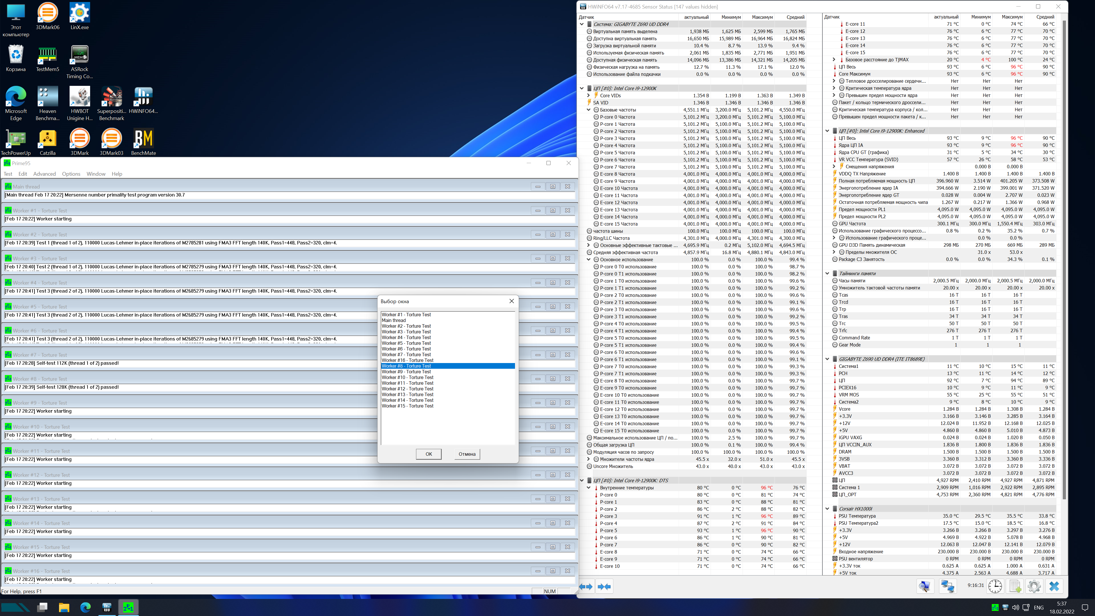 Это еще цветочки. Я тут Prime 95 процессор затестил)))) Там где в LinX потреблялось 200Вт в Прайме улетело тут же в 225Вт температуры ударились в сотку на 1,28В и кулере D-15. Я не представляю что там с 12700К и 12900К даже на воде. Прайм это самый жестокий тест.