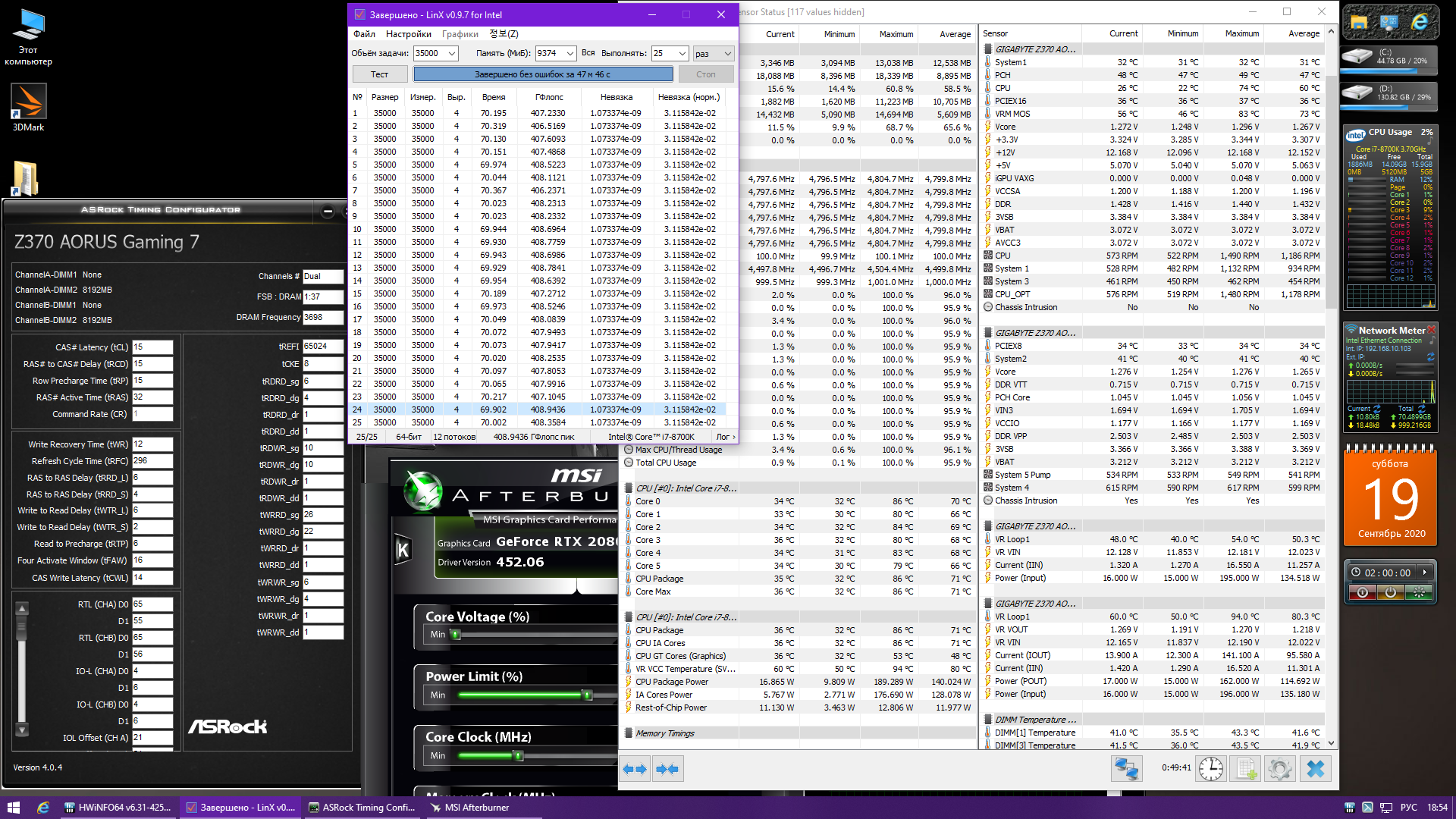Полученный результат должен иметь следующий вид: Скриншот рабочего стола после прохождения >9 циклов (т.е. между 9 и 10 проходами). Вместе с LinX на рабочем столе должны быть развернуты CPU-Z (первая вкладка) и Core Temp, это обязательный минимум. Такой набор программ даст информацию о напряжении и температурах под нагрузкой-простоем. По желанию можете добавить другие программы, показывающие дополнительную информацию о вашей системе, например третью вкладку CPU-Z, которая покажет модель материнской платы и версию BIOS. Пример результата разгона: Mad Max, 5100 МГц (AVX 0), i7-8086K, HT-ON, Cache 4700, Vcore=1.36V, Batch L805E123, Gigabyte Z370 Aorus Gaming 7 (bios F6), Be Quiet! Dark Rock Pro 4, ЖМ под HS, Windows 10 Pro 64-bit 1809, LinX 0.9.3 64bit.