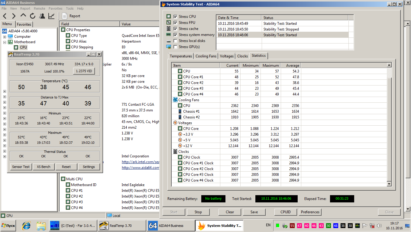 И вот после запуска всех свистелок-перделок я вдруг обнаружил подозрительно низкую температуру на ядрах этого E5450. На одном так вообще крайне низкая! Просто нереальные 12°С сразу после запуска винды! При том, что в этом месте комнаты ну никак ниже 20°С не может быть! Термометр в другом конце комнаты кажет +25.7°С! Остальные ядра были тоже подозрительно холодные... В общем что-то меня настораживает эта подозрительно низкая температура ядер. Да я слышал, что E0 похолоднее C0, но не на столько же!