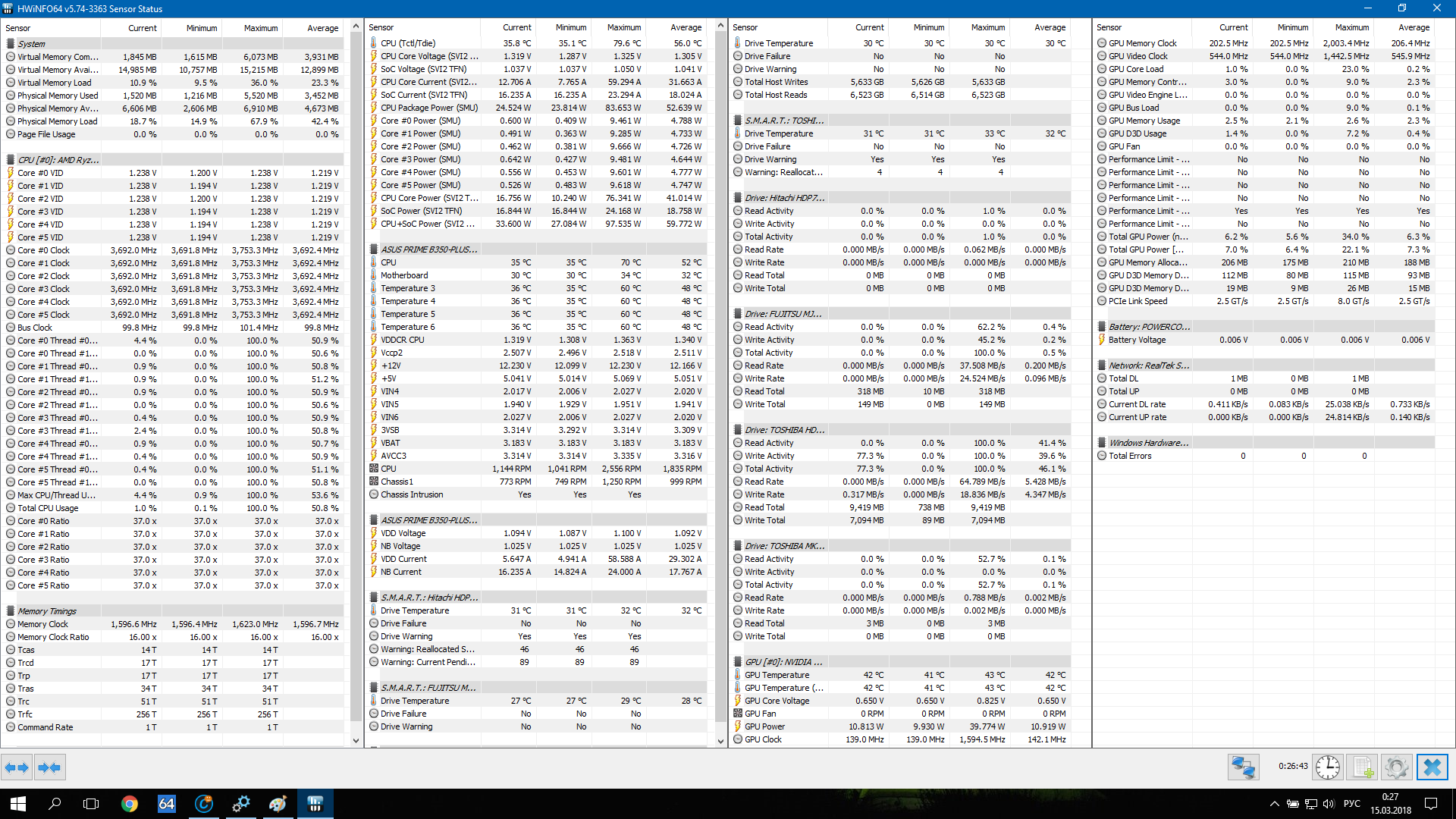 - Обычно поставляется в коробке с системой охлаждения Wraith Spire RGB (это круглая конструкция из целого куска алюминия с медной вставкой-испарительной камерой в основании и вентилятором с кольцом разноцветной подсветки, крепится к задней пластине разъёма AM4 четырьмя винтами). - Штатно имеет базовую частоту 3.0ГГц, частоту 3.2ГГц (технология Turbo Boost) при обычной многопоточной нагрузке (Blender n-cores render) и 3.75ГГц (технологии Precision Boost и XFR) при однопоточной нагрузке (Cinebench R15 single core). - Штатное напряжение питания 1.1875В. Может возрастать до 1.3В на отдельных ядрах во время работы Precision Boost и XFR. - Очень энергоэффективный, требования к СО (TDP) - всего 65W. Энергопотребление порядка 10Вт в простое и 85Вт в обычной многопоточной нагрузке (Blender n-cores render).