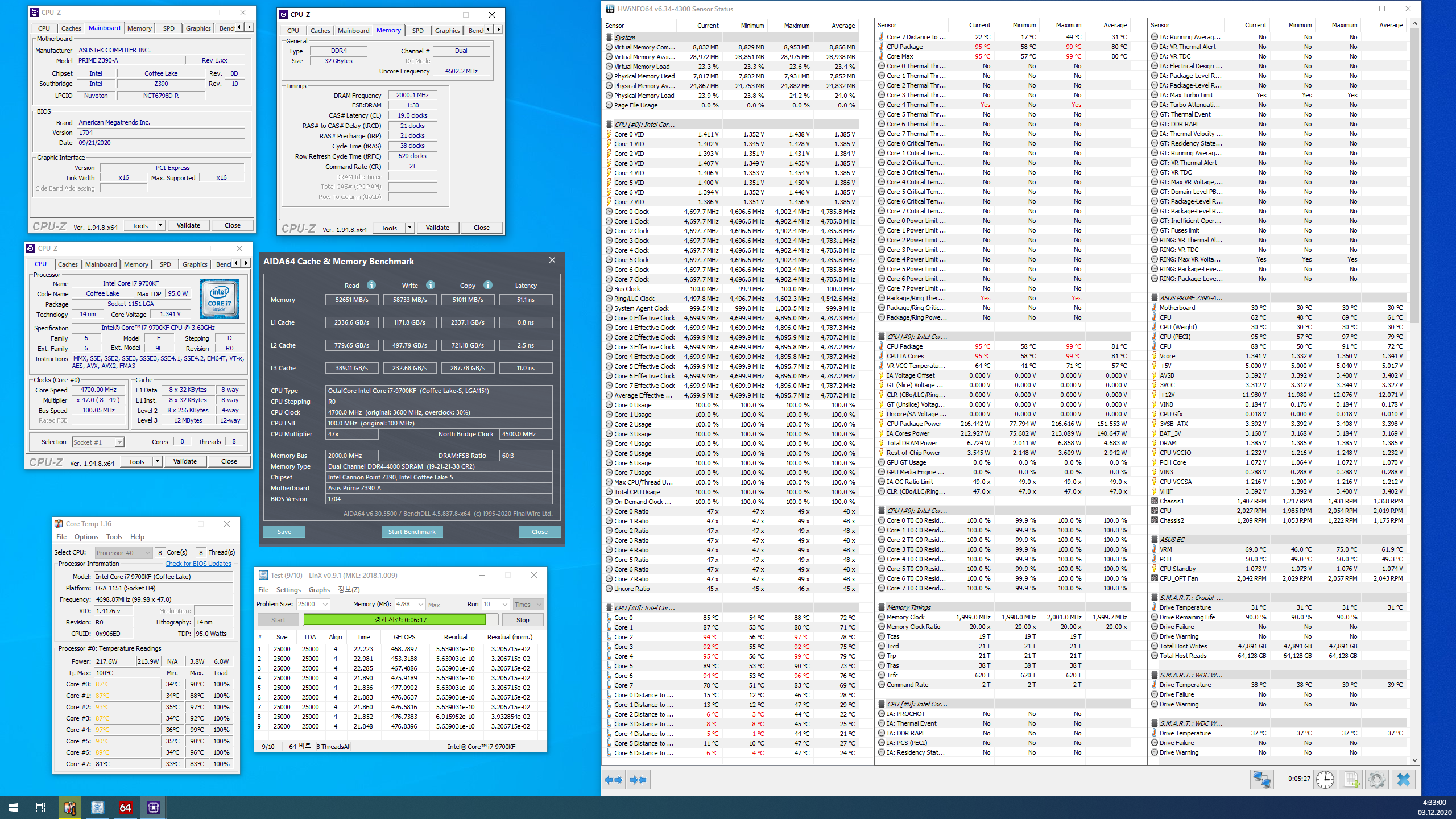 Полученный результат должен иметь следующий вид: Скриншот рабочего стола после прохождения >9 циклов (т.е. между 9 и 10 проходами). Вместе с LinX на рабочем столе должны быть развернуты CPU-Z (первая вкладка) и Core Temp, это обязательный минимум. Такой набор программ даст информацию о напряжении и температурах под нагрузкой-простоем. По желанию можете добавить другие программы, показывающие дополнительную информацию о вашей системе, например третью вкладку CPU-Z, которая покажет модель материнской платы и версию BIOS. Пример результата разгона: Mad Max, 5100 МГц (AVX 0), i7-8086K, HT-ON, Cache 4700, Vcore=1.36V, Batch L805E123, Gigabyte Z370 Aorus Gaming 7 (bios F6), Be Quiet! Dark Rock Pro 4, ЖМ под HS, Windows 10 Pro 64-bit 1809, LinX 0.9.3 64bit.