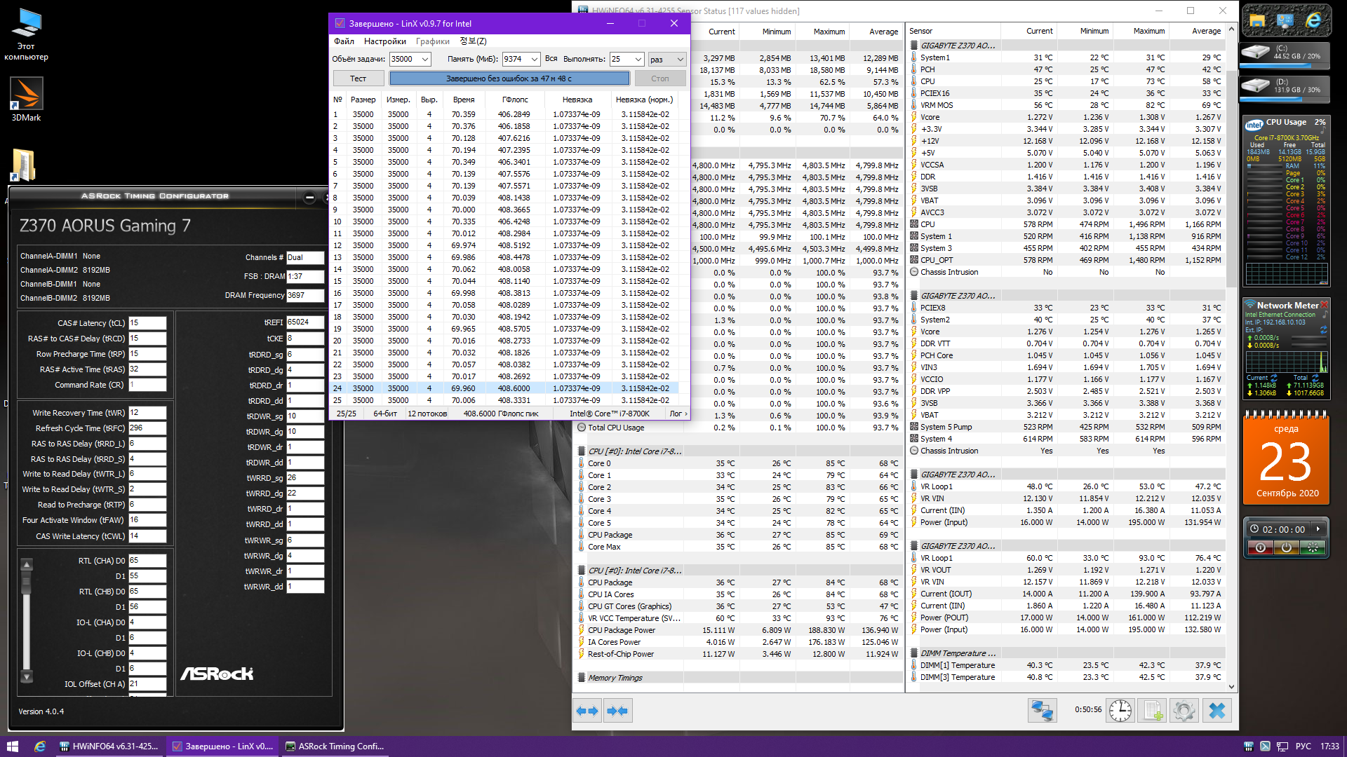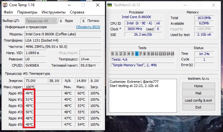 Полученный результат должен иметь следующий вид: Скриншот рабочего стола после прохождения >9 циклов (т.е. между 9 и 10 проходами). Вместе с LinX на рабочем столе должны быть развернуты CPU-Z (первая вкладка) и Core Temp, это обязательный минимум. Такой набор программ даст информацию о напряжении и температурах под нагрузкой-простоем. По желанию можете добавить другие программы, показывающие дополнительную информацию о вашей системе, например третью вкладку CPU-Z, которая покажет модель материнской платы и версию BIOS. Пример результата разгона: Mad Max, 5100 МГц (AVX 0), i7-8086K, HT-ON, Cache 4700, Vcore=1.36V, Batch L805E123, Gigabyte Z370 Aorus Gaming 7 (bios F6), Be Quiet! Dark Rock Pro 4, ЖМ под HS, Windows 10 Pro 64-bit 1809, LinX 0.9.3 64bit.
