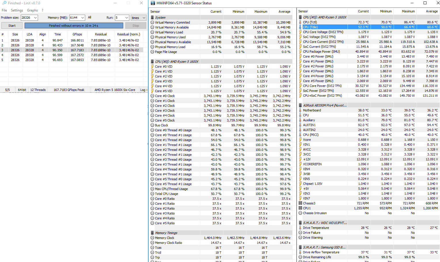 Как раз также сегодня с утра выставил в BIOS 1.125 В, но частоту повыше - 3750 МГц. Также всегда запускаю 5 прогонов linx 6 ГБ, но с отключенным тротлингом. Потом, если надо, запускаю и на подольше. В итоге без невязок получилось 167 флопсов и макс 66°C при довольно низких средних оборотах вентилей (ЦП - 1200, 2 корпусных - 600). На макс оборотах (1600/1200) будет ниже 60°C. Напряжение по мониторингу во время теста прыгало вплоть до макс 1.16 В, в среднем же получилось 1.135 В. LLC на плате нет. Мощность в моем случае смотреть смысла нет так как Асрок, как известно, ее завышает. Но если все же интересно, CPU + SoC Power было макс 150 Вт. Не знаю какой у вас охлад ЦП и корпуса, но температура действительно высоковата. Правда и комнатная температура у вас высокая, видимо, все дело как раз в этом. У меня сейчас в качестве охлада 600-граммовая башня с прямым контактом стоимостью $30.