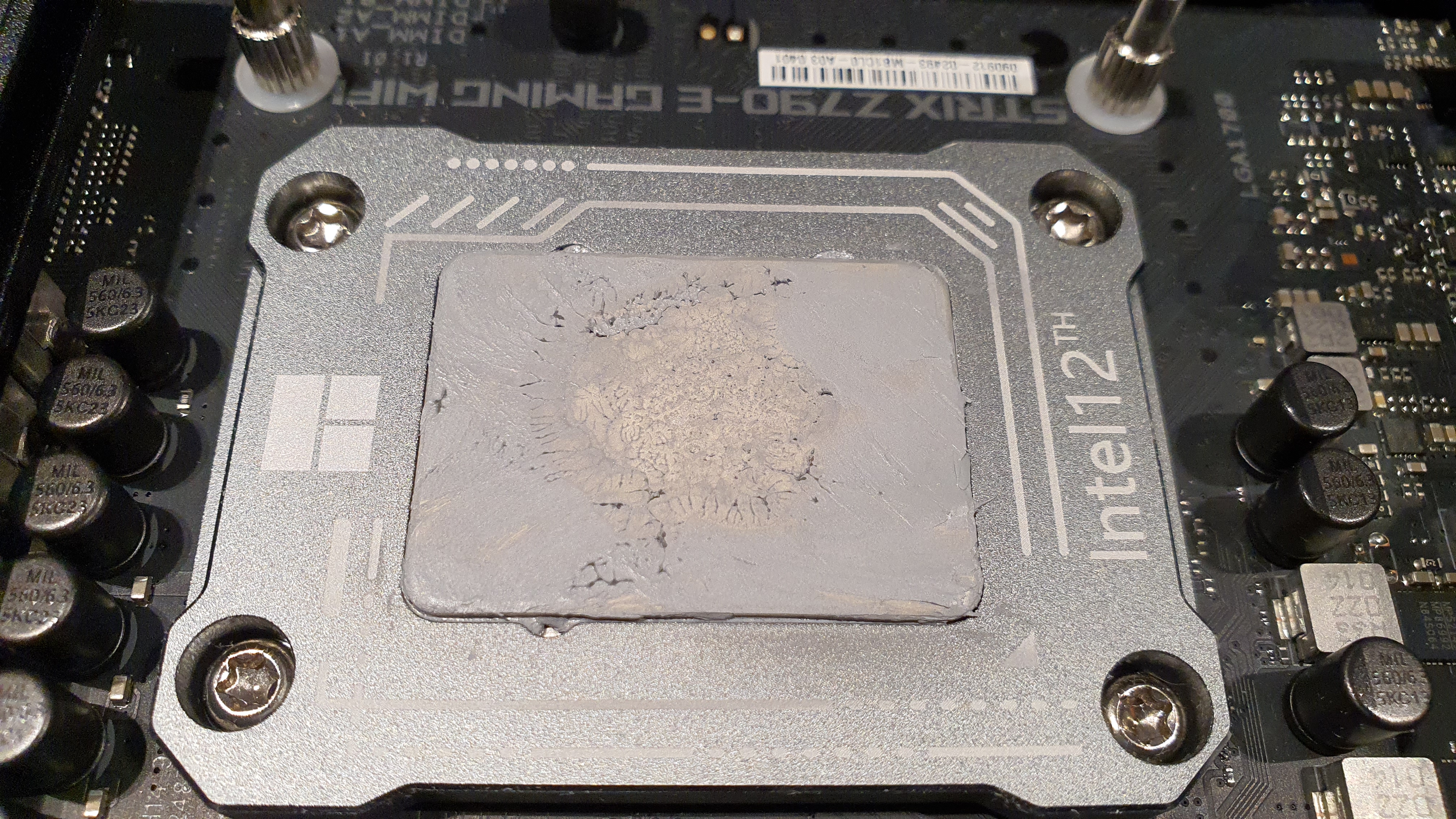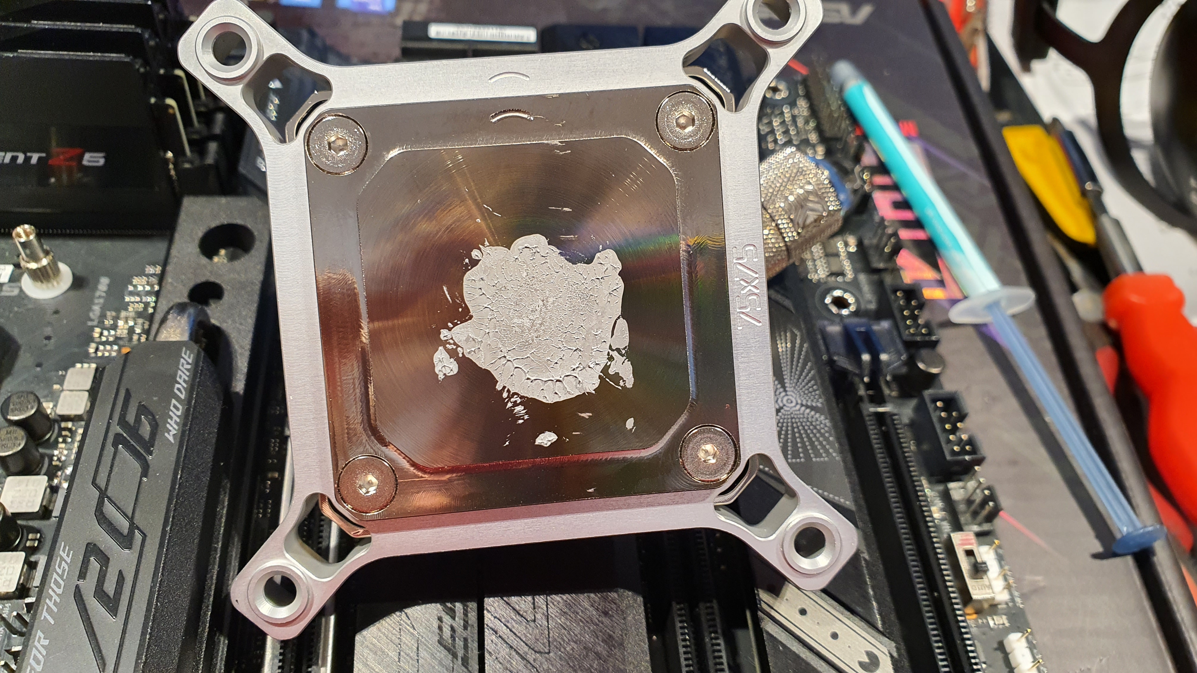 У крышки 13900k был явный горб по центру. У водоблока EK Quantum Magnitude тоже горб по центру. При примерке одно катается по другому. Думаю ладно, ну не может же быть что при полном прижиме такое сохранится. Намазал густую MX-6 тонким слоем, прикрутил водоблок, затянув до упора, что аж плата выгнулась, открутил, там вот такая картина: